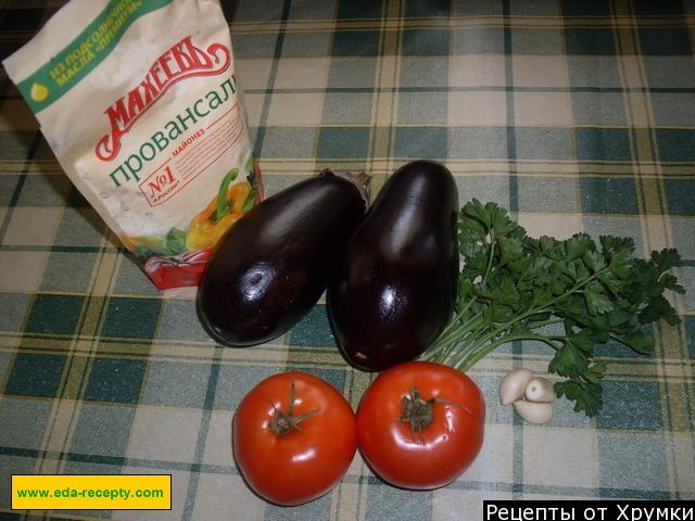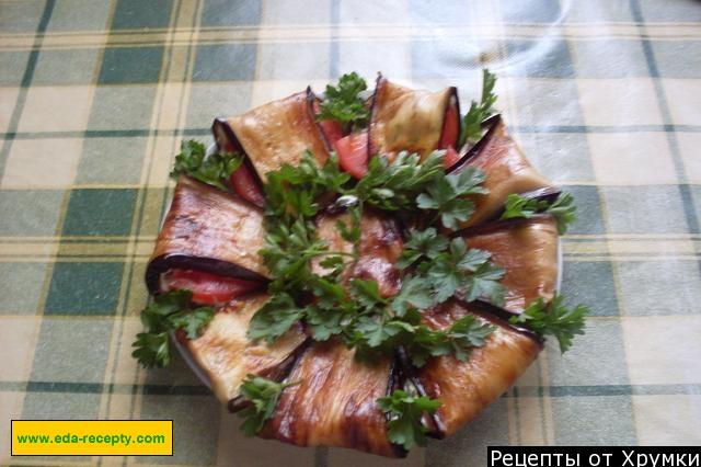 teraz rozłóż trochę majonezu czosnkiem na połowie języka bakłażana, przykryj majonez plastikiem pomidora, połóż gałązkę koperku i przykryj drugą (wolną) połową tego samego języka. Naprawiamy wykałaczką. Wszystkie zwinięte w ten sposób zakładki układamy na talerzu. Czasami są zwijane. Następnie pomidory można pokroić w plasterki.
