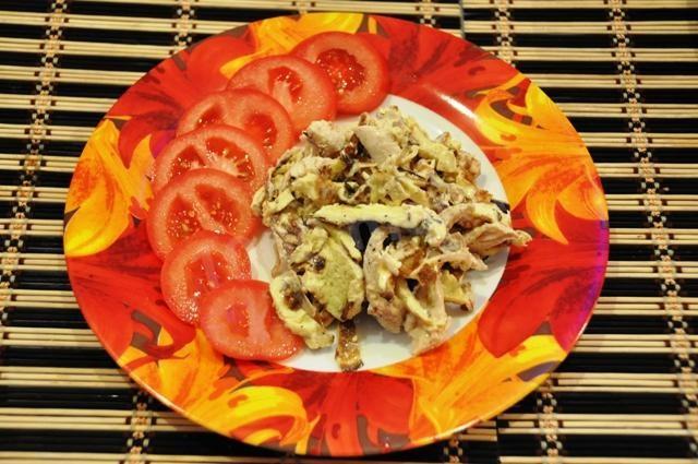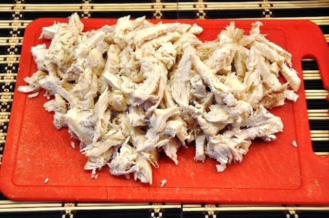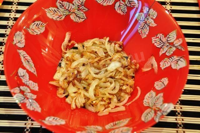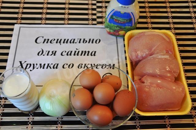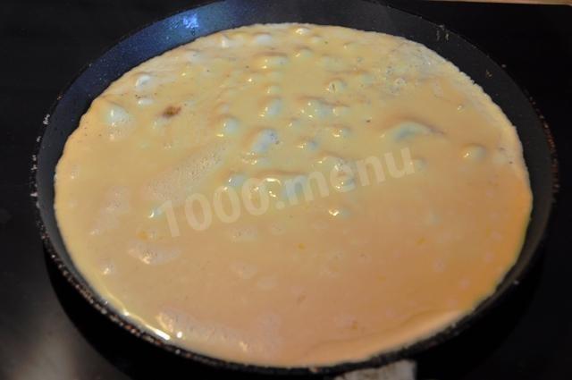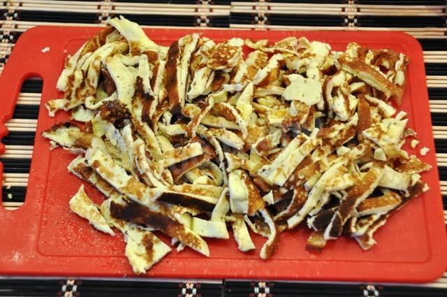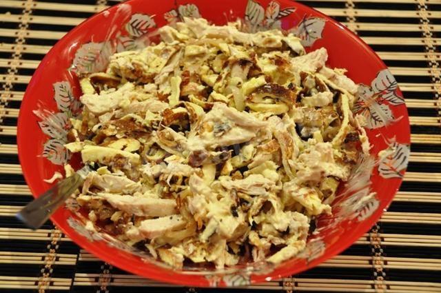 na początek ugotujemy bezpośrednio omlet. Aby to zrobić, ubij surowe jajka w misce, dodaj mleko, sól, dokładnie wymieszaj, przefiltruj przez sito. Następnie wlej całą tę mieszaninę do gorącej patelni ze stopionym masłem, przykryj i smaż na średnim ogniu przez 3-4 minuty. Gdy omlet jest gotowy i schłodzony, pokrój go w paski. Cebulę kroimy w półpierścienie i smażymy na oleju, mieszamy z pokrojonym omletem. Dodaj mięso z kurczaka, również pokrojone w paski, drobno posiekane warzywa. Doprawiamy majonezem. Możesz podać do stołu!!! Smacznego!!!