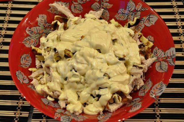Sałatka z omletem i wędzonym kurczakiem i majonezem