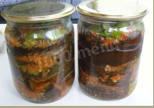 przygotowane bakłażany są nadziewane mieszanką cebuli i ziół. Dodaj trochę sosu pomidorowego do wysterylizowanych słoików, a następnie włóż bakłażana i napełnij gorącym pomidorem na wierzchu, bez dodawania 2,5 centymetra do krawędzi słoika. Sterylizujemy w łaźni parowej-60-100 minut, w zależności od objętości naczyń.