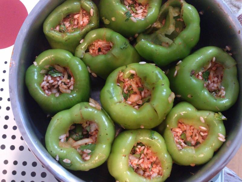 opłucz ryż i pozostaw go do spęcznienia w wodzie podczas przygotowywania pozostałych składników. Opłucz paprykę i wyjmij z niej ogony. Do nadzienia odpowiednia jest duża cebula (lub dwie małe), drobno posiekaj, dodaj pietruszkę i miętę (jeśli nie ma świeżej mięty, odpowiednia jest suszona), koncentrat pomidorowy, przyprawy, oliwa z oliwek. Nadziewamy paprykę nadzieniem, wkładamy do rondla, zalewamy wodą i gotujemy na małym ogniu do miękkości.