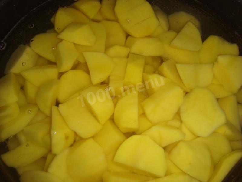 Obierz ziemniaki. Umyć. Pokroić na kawałki. Napełnij wodą i umieść na kuchence. Wlewam więcej wody i jak tylko utworzy się piana, spuszczam ją z nadmiarem wody.
