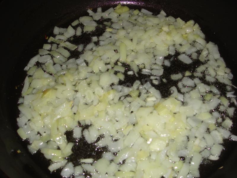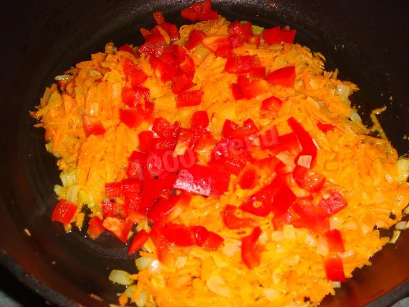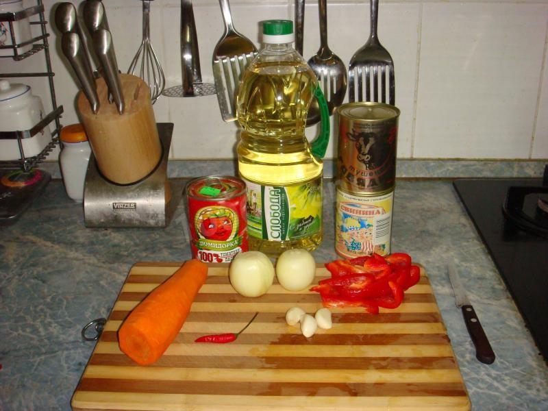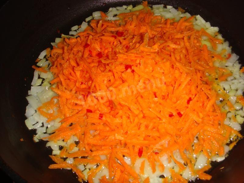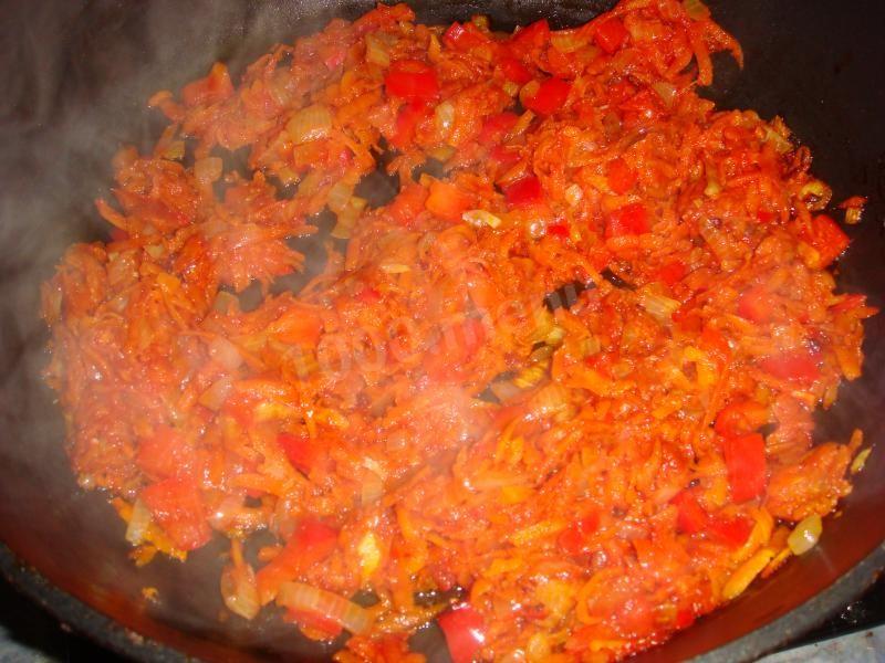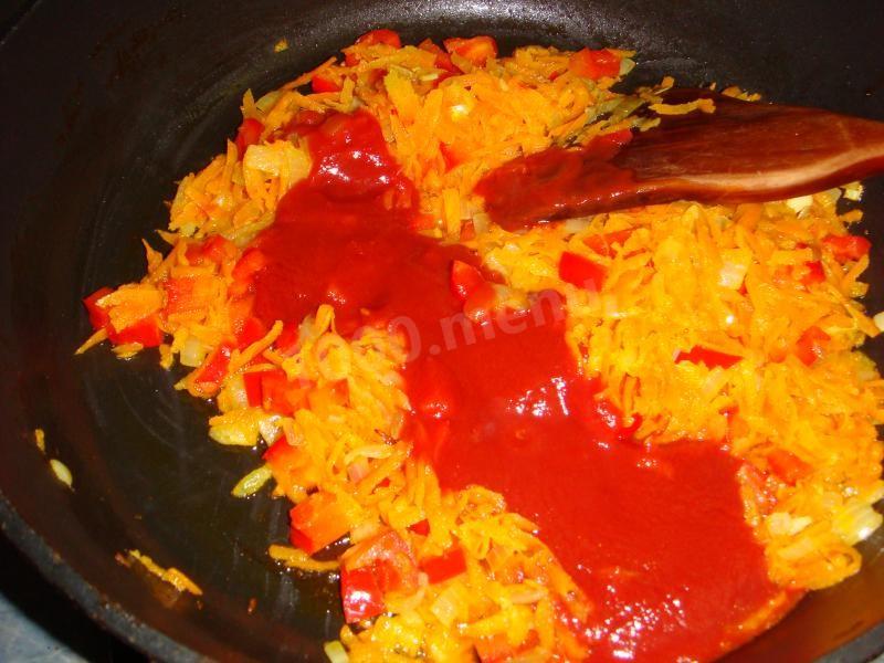na patelni podsmaż cebulę, następnie startą marchewkę, pokrojoną w kostkę paprykę, chili. Zalej wszystko pastą pomidorową rozcieńczoną w 50 ml wody.
