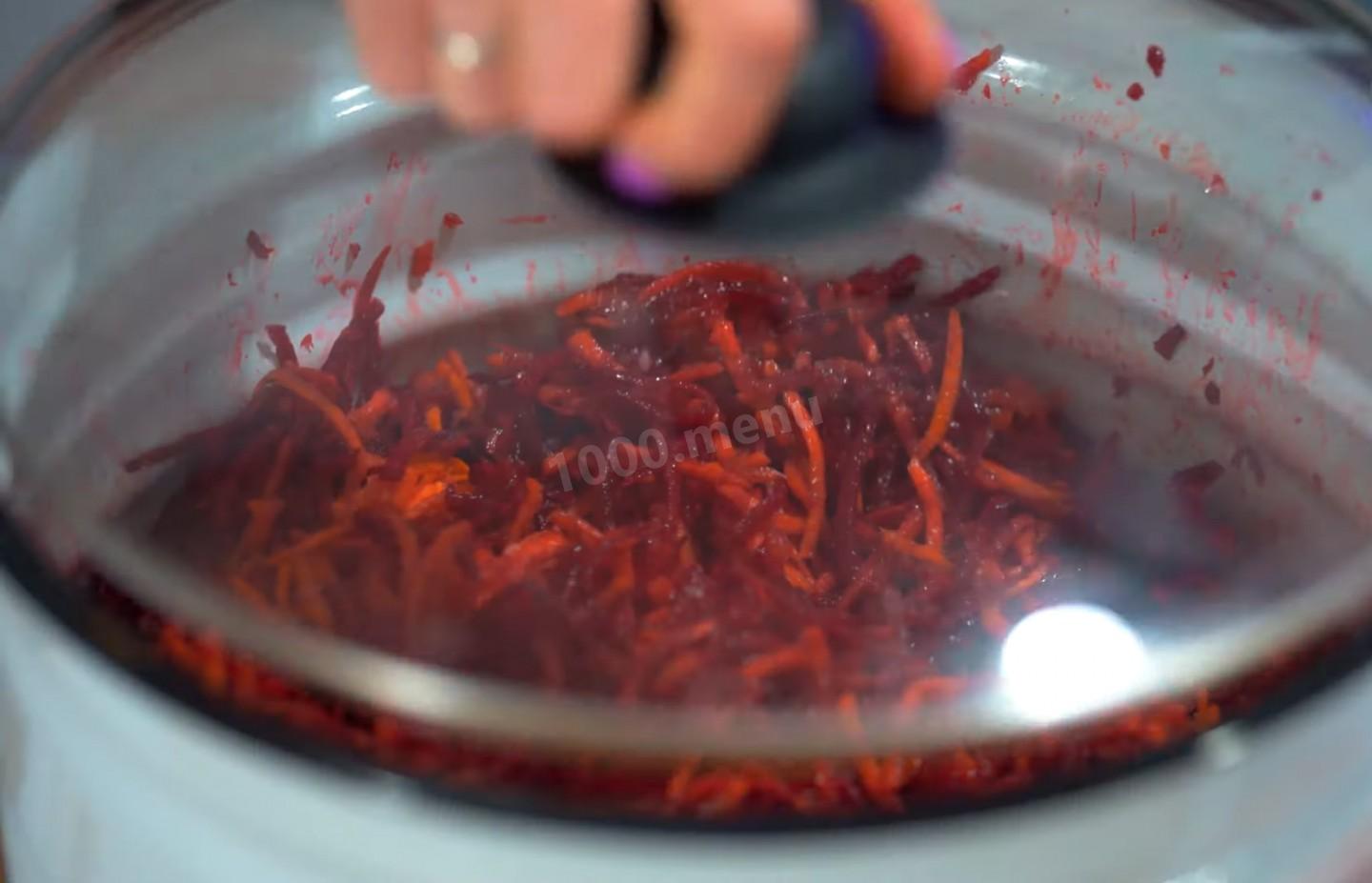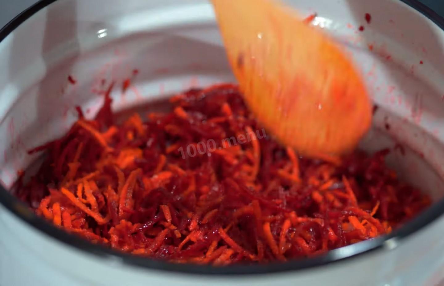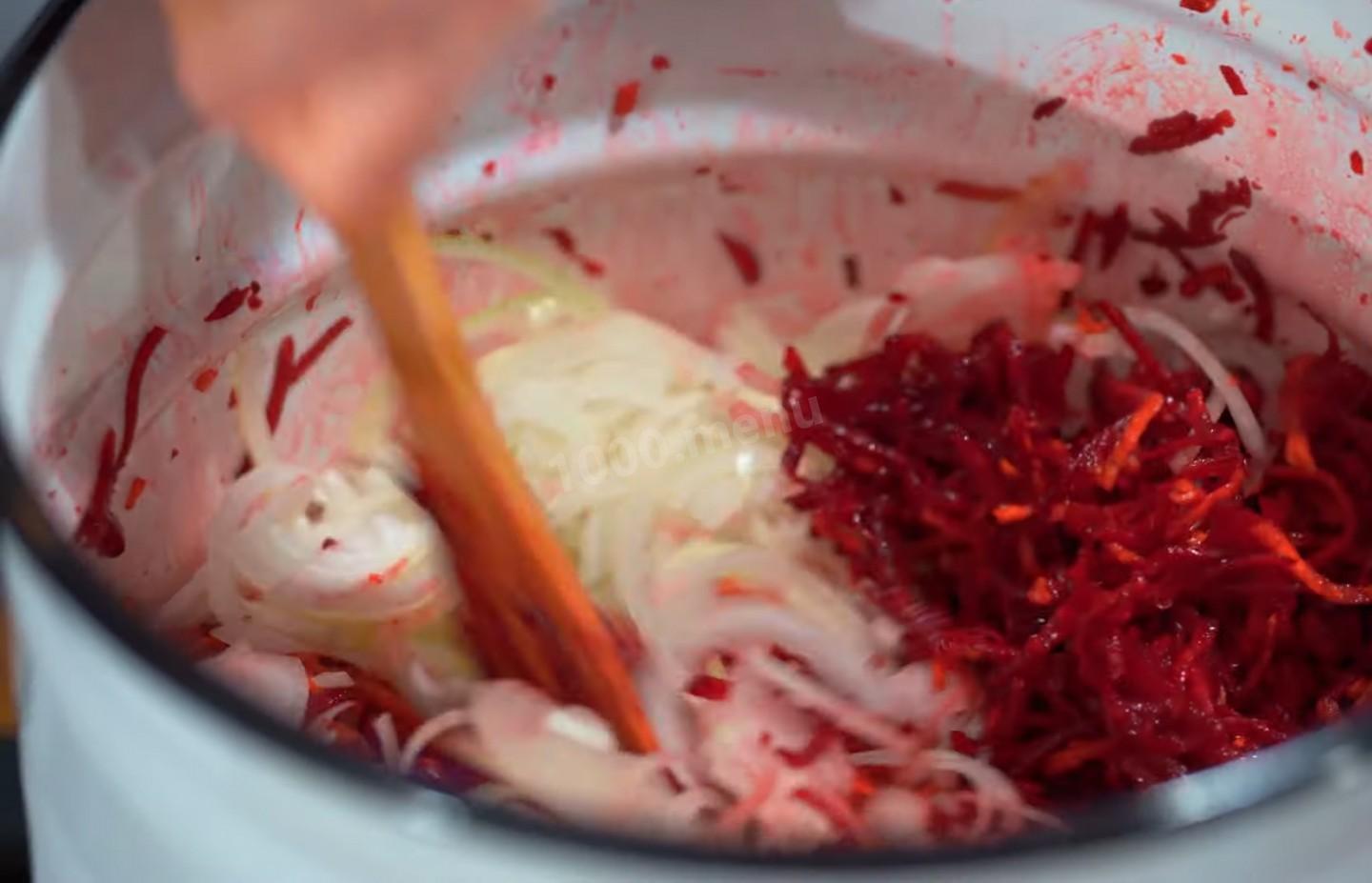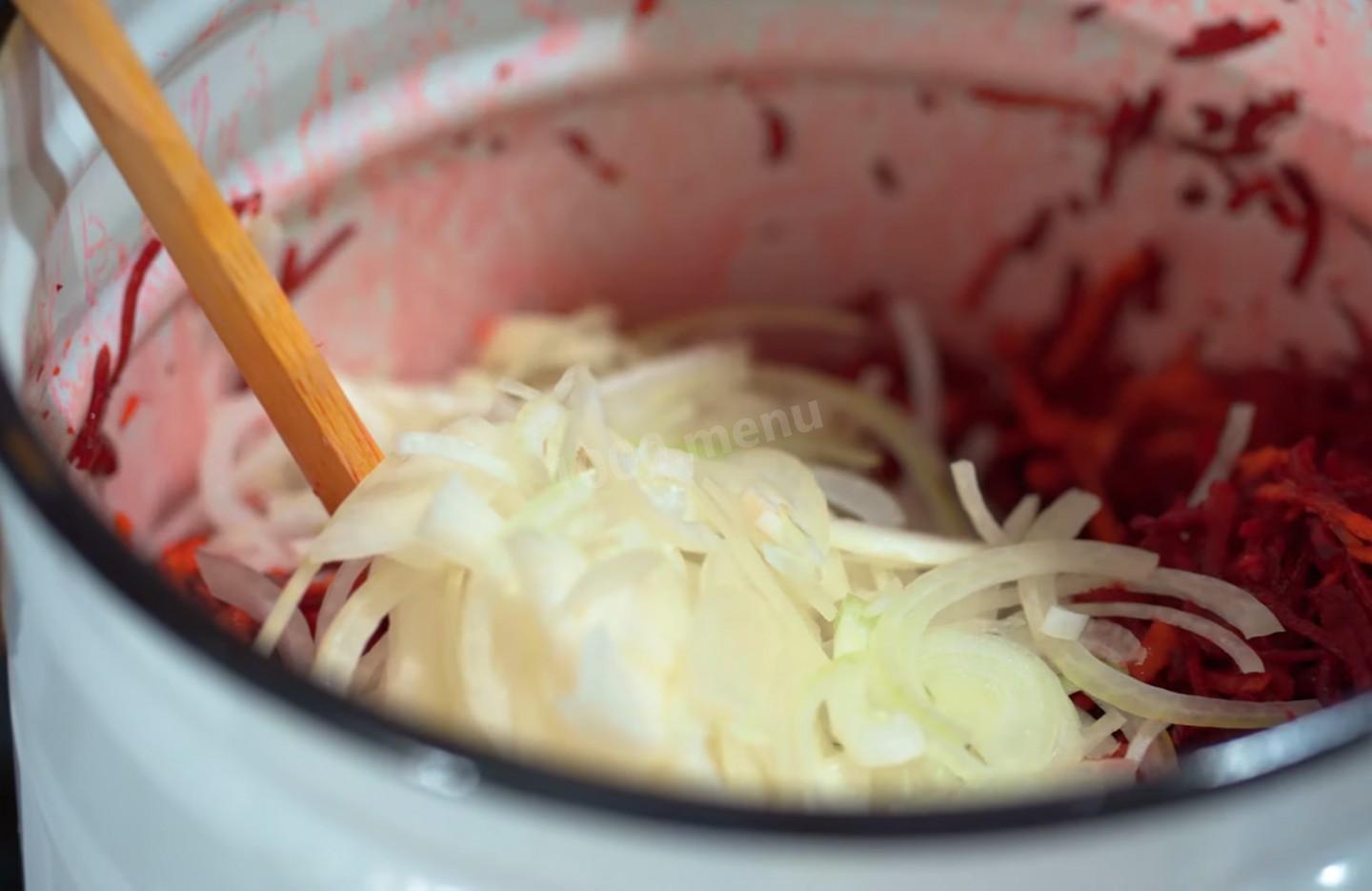Rozłóż posiekaną cebulę na patelni z burakami i marchewką.