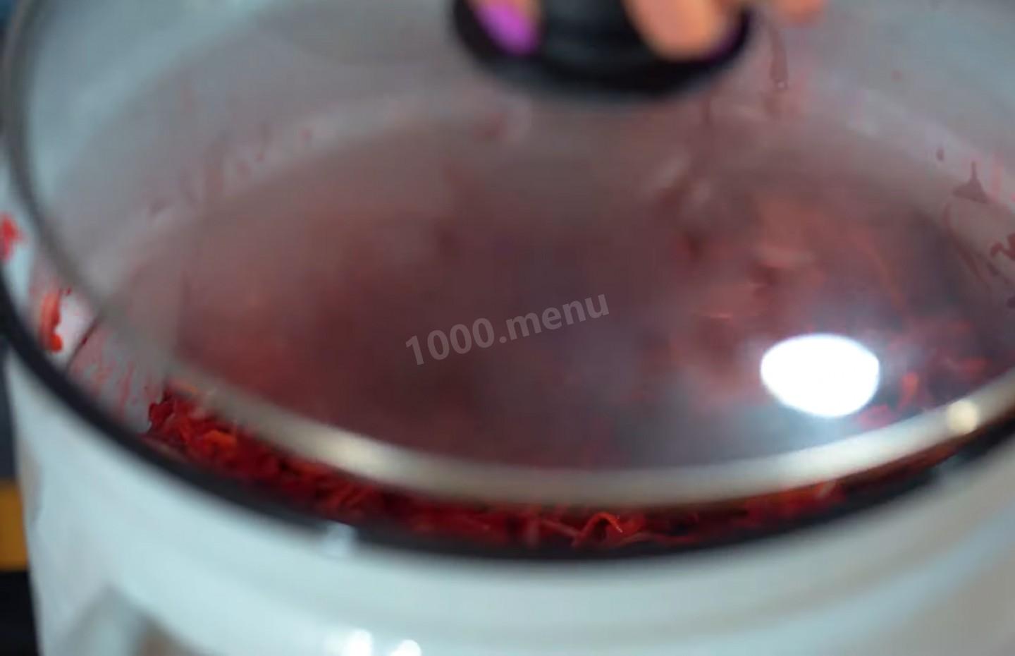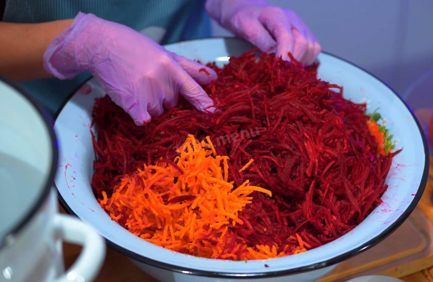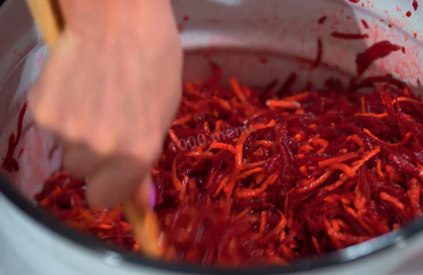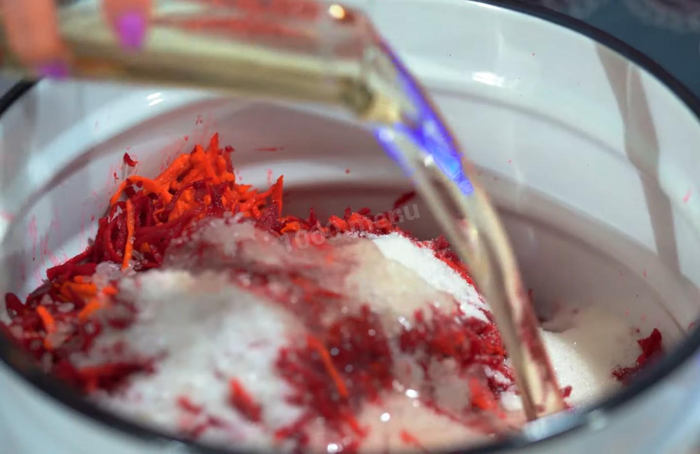 Pocieramy trzy kilogramy buraków i jeden kilogram marchwi na grubej tarce, a następnie wkładamy warzywa do dużej emaliowanej patelni.