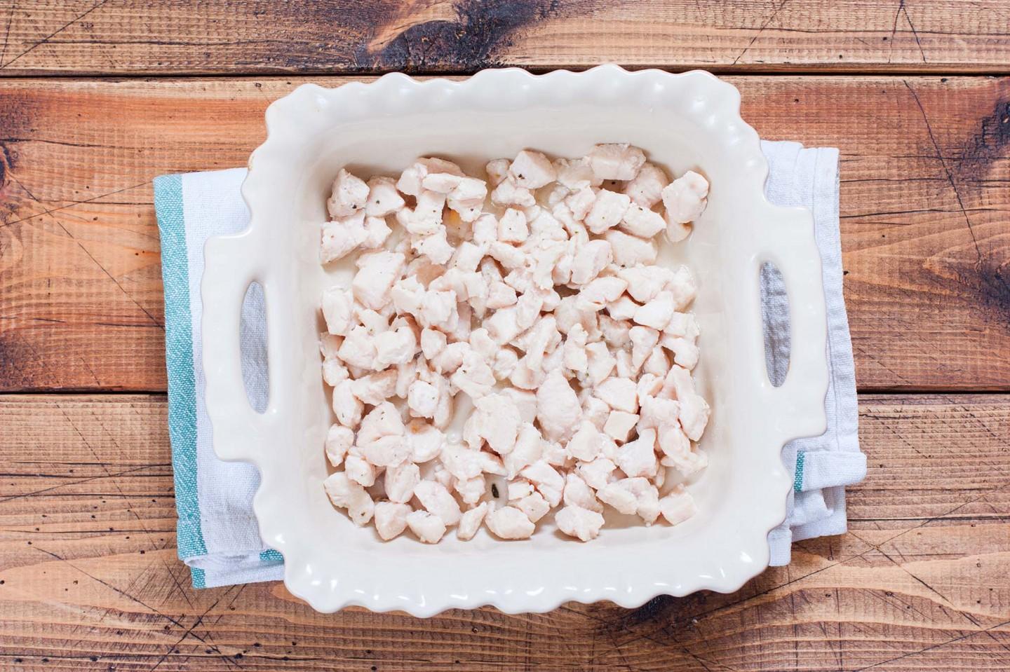 Umieść naczynie do pieczenia na stole, włóż do niego smażony filet z kurczaka, zakrywając całe dno. Połóż kapustę zdemontowaną na kwiatostanach na wierzchu fileta z kurczaka.
