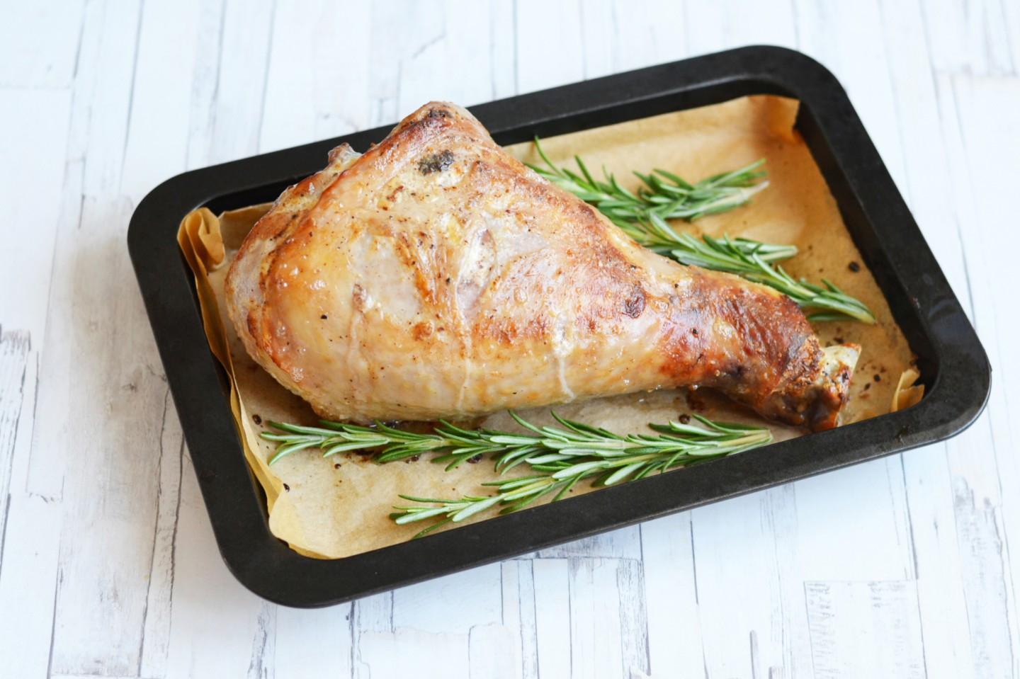 Gdy na powierzchni pojawi się złota rumiana skórka, wyciągnij formę z indyka i rozłóż gałązki rozmarynu po bokach nogi.