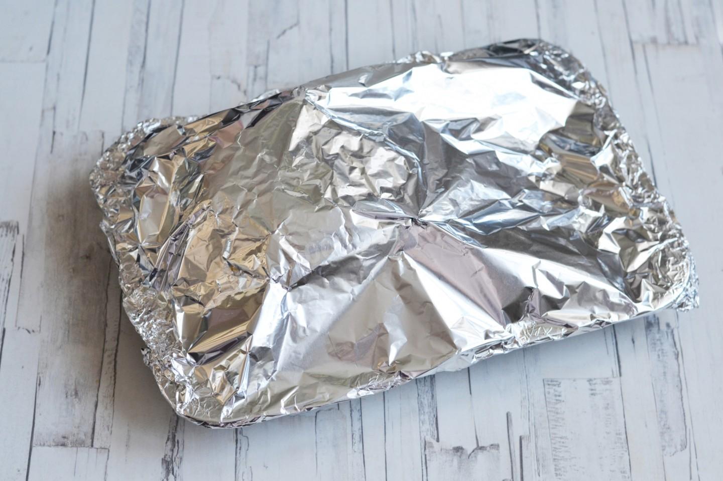 Przykryj formę folią lub pokrywką (jeśli jest dostępna) i Wróć nogę do piekarnika, zmniejsz ogień do 180°C i piecz przez około 50 minut, aż będzie miękka. ! Aby zapobiec przywieraniu chrupiącej skórki do folii podczas rozpakowywania gotowego mięsa, staraj się, aby folia nie dotykała samej podudzia. A także nasmaruj wewnętrzną powierzchnię folii olejem roślinnym.