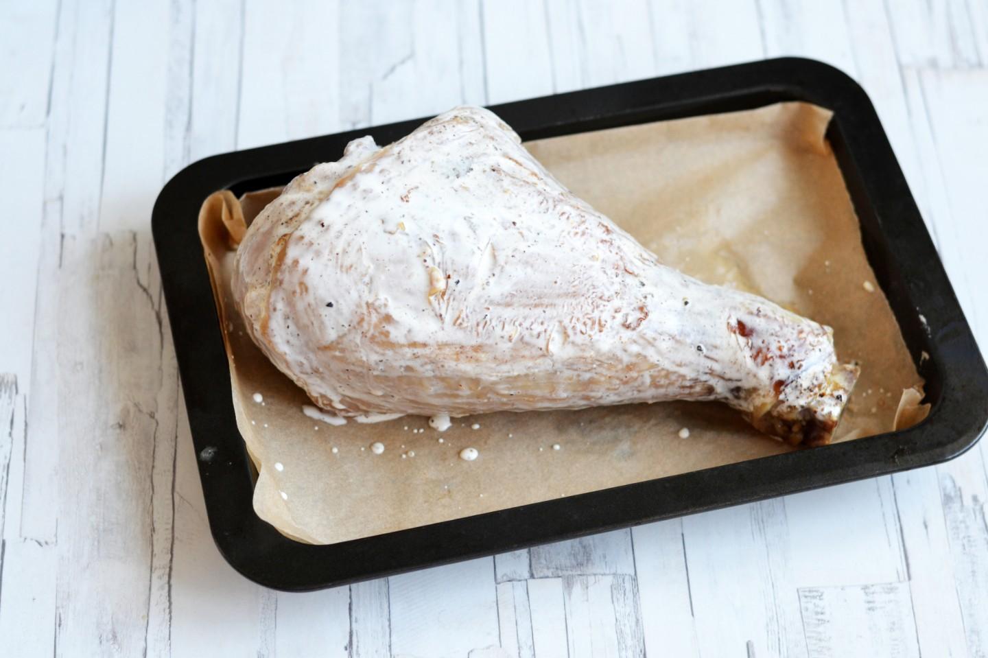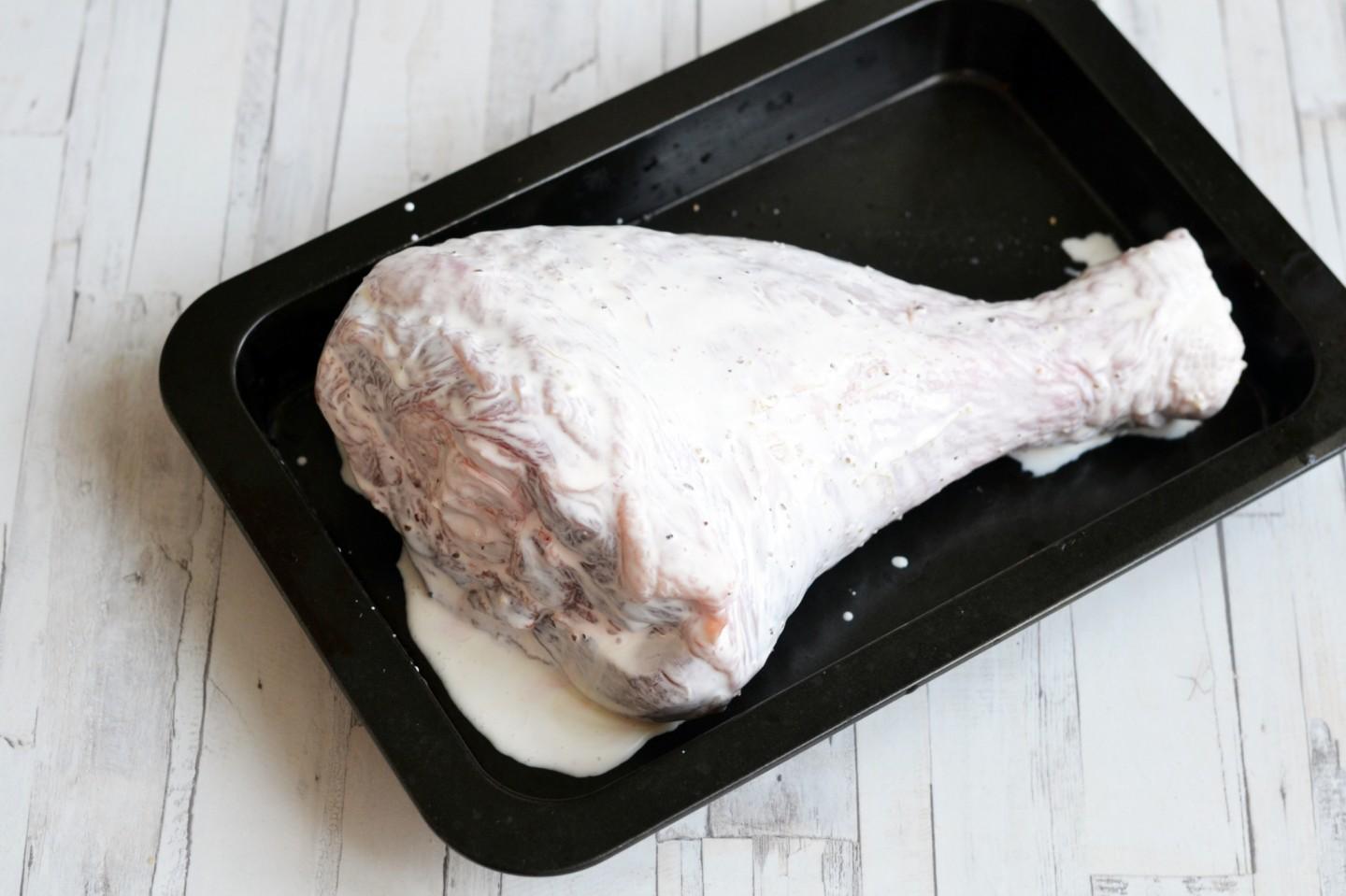 Następnie odwróć nogę na drugą (niepieczoną) stronę i posmaruj pozostałą śmietaną. Włóż podudzie do piekarnika, aby zrumienić po drugiej stronie.