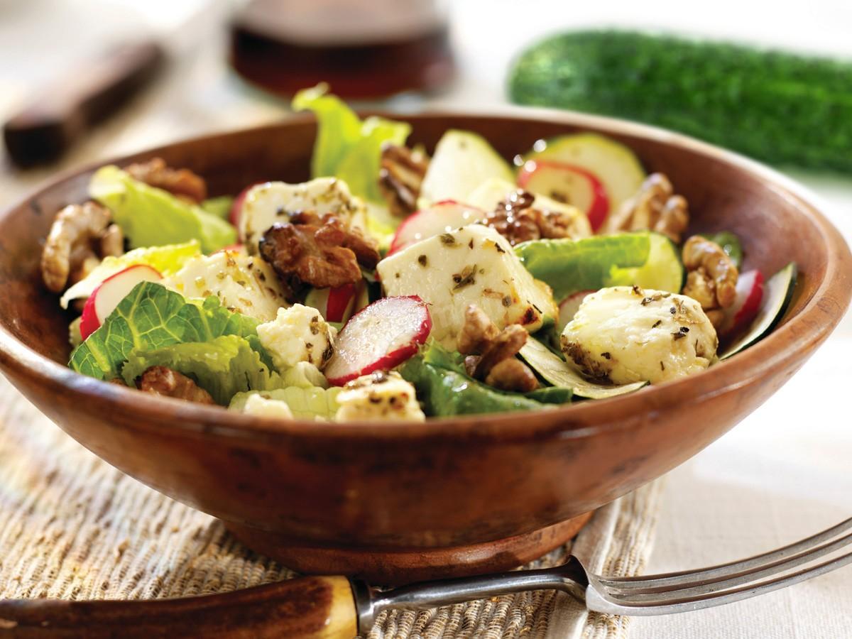 10. Rozłóż liście sałaty, rzodkiewki i cukinię w głębokiej misce sałatkowej. Tutaj kładziemy pieczoną fetaxę i orzechy włoskie.