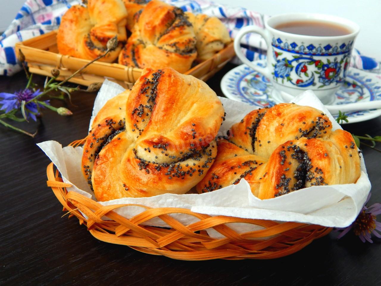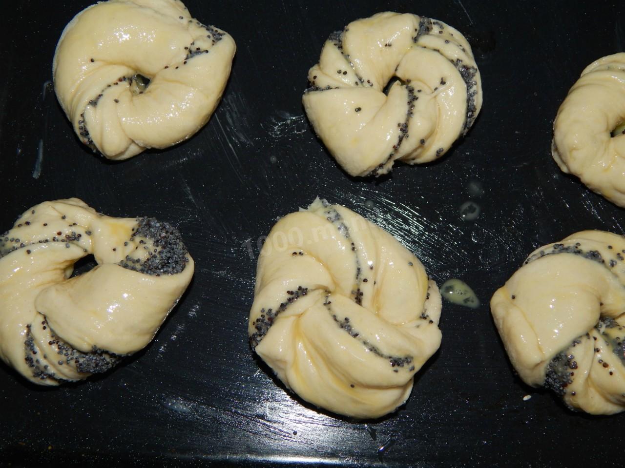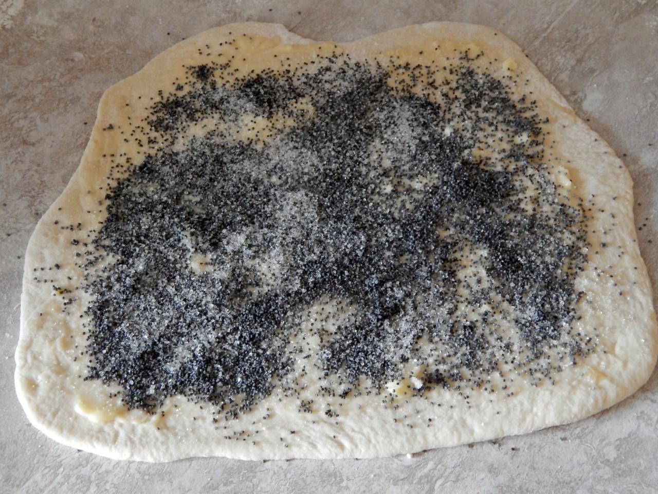Gotowe ciasto dzieli się na kilka części. Rozwałkuj je w prostokąt. Posmaruj ciasto zmiękczonym masłem. Na wierzch nakładamy nadzienie makowe i posypujemy cukrem.