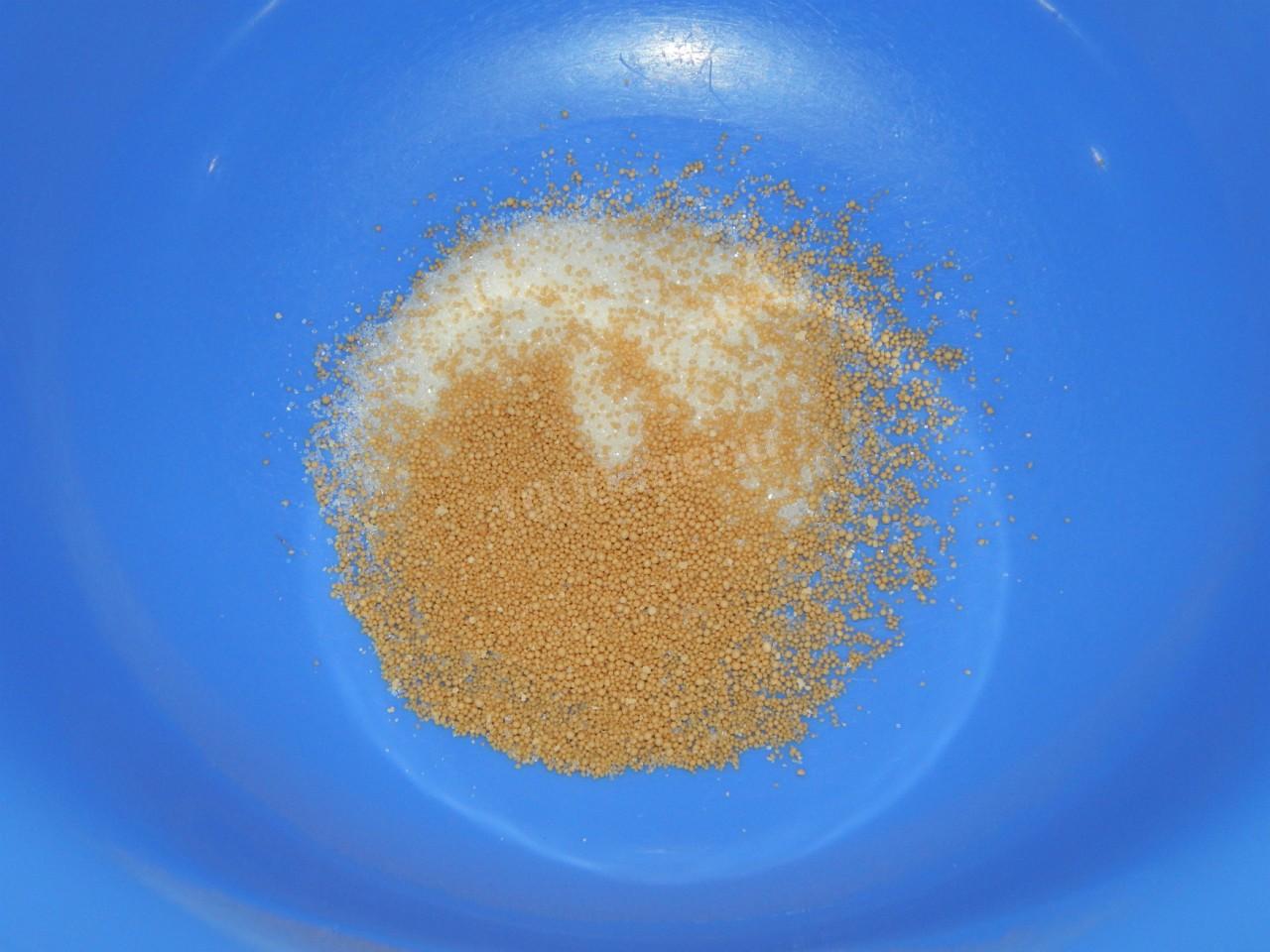 Do miski wsyp łyżkę cukru i łyżkę mąki, suche drożdże.