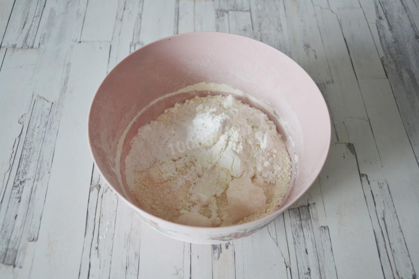 Połącz przesianą mąkę, 200 g cukru (dodałam 150 g cukru), skrobię i proszek do pieczenia. Wszystko dokładnie wymieszaj.