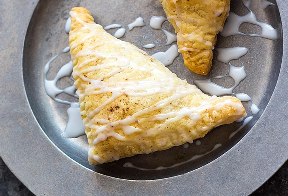 5. Lekko posyp powierzchnię roboczą mąką. Wyjmij ciasto francuskie i rozwałkuj je na dwa cienkie, równe rozmiary i kształt kwadratowego arkusza. Pokrój każdy arkusz na cztery równe części. Połóż wcześniej przygotowane nadzienie jabłkowe na jednej połowie każdej części, rozprowadzając je równomiernie na 1/2 części kawałka ciasta. Przykryj posiekane jabłka przyprawami drugą połową ciasta i przymocuj krawędzie widelcem, mocno dociskając je do krawędzi ciasta. W ten sposób uformuj 4 bułki z jednego arkusza i tyle samo z drugiego.