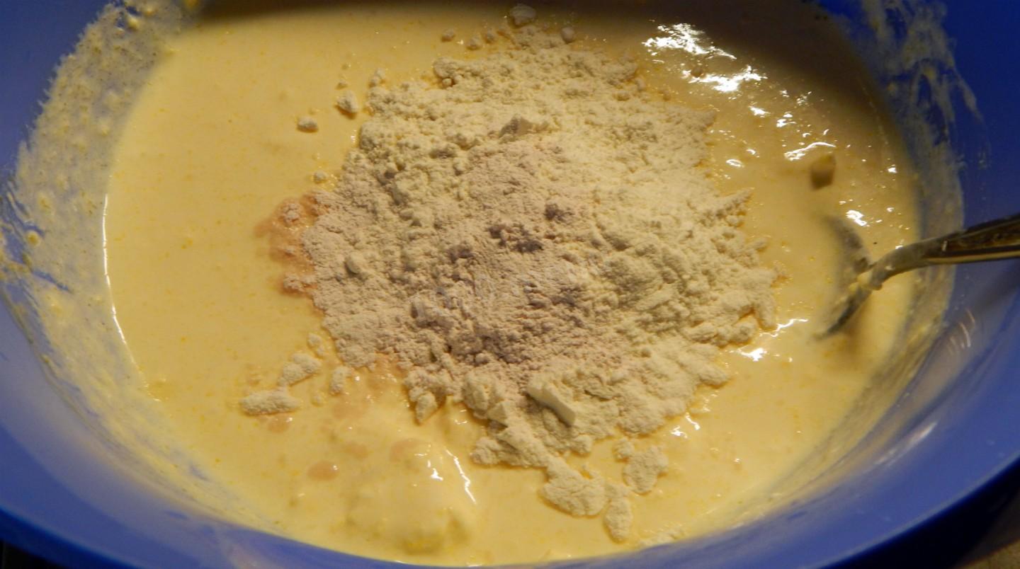 Wlej przesianą mąkę w częściach i połączoną z proszkiem do pieczenia. Bardzo szybko zagnieść elastyczne gładkie ciasto. Mąka może wymagać nieco więcej lub mniej, w zależności od gęstości i jakości produktu.