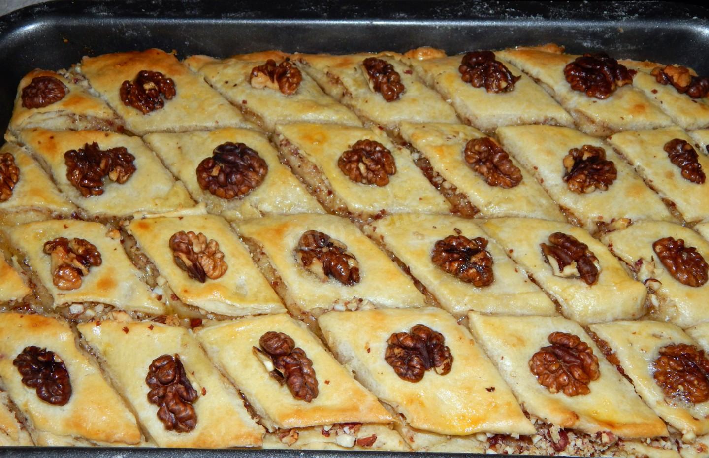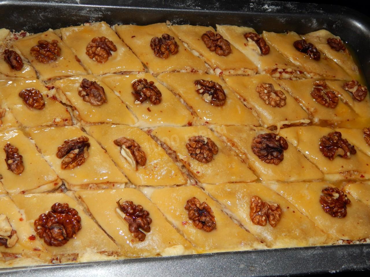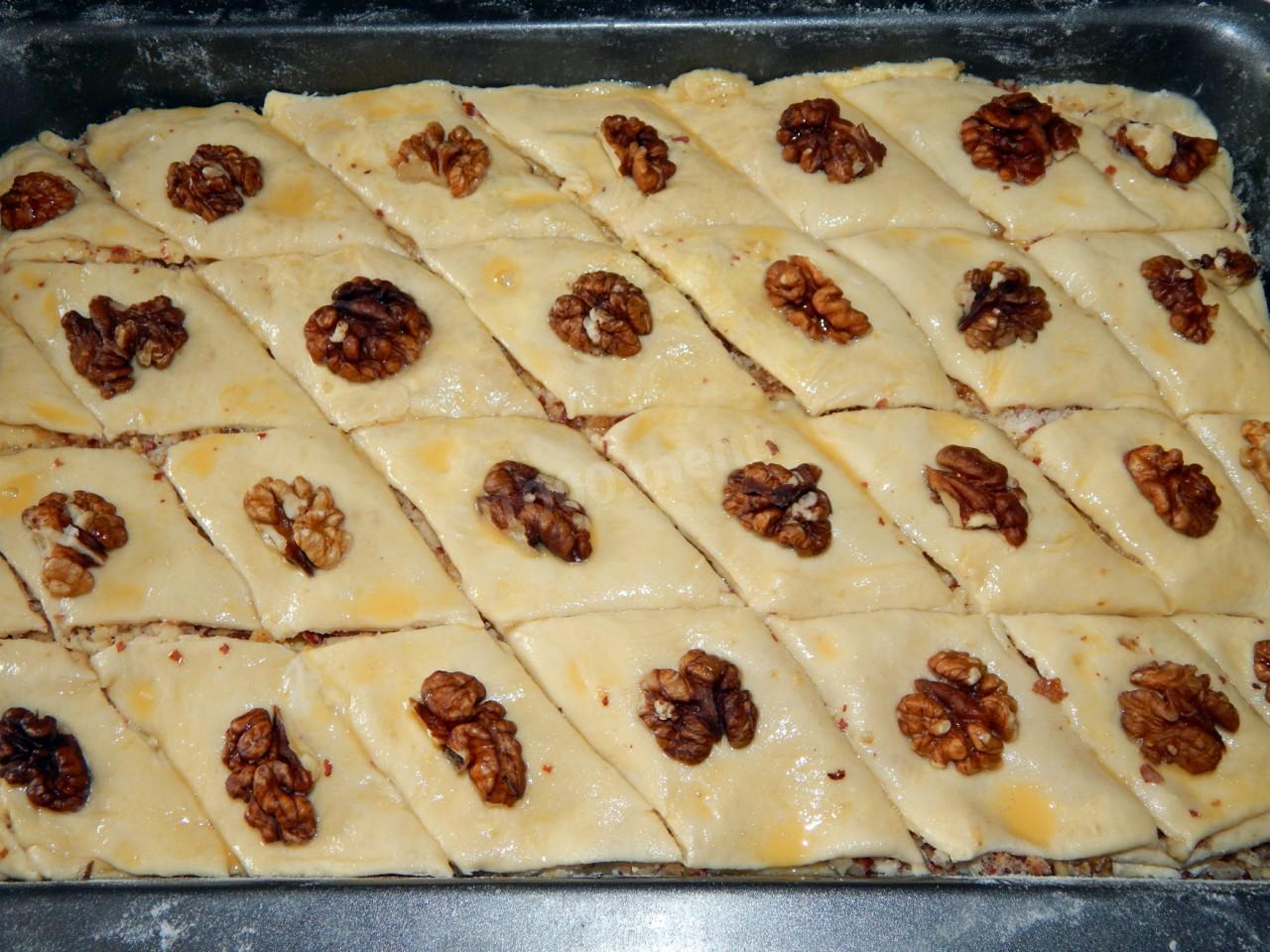 Posmaruj wierzch ciasta ubitym jajkiem kurzym. Na każdym rombie na środku kładziemy kawałek orzecha włoskiego. Piekarnik rozgrzewamy do 200 stopni. Włóż baklawę do piekarnika na 15 minut.