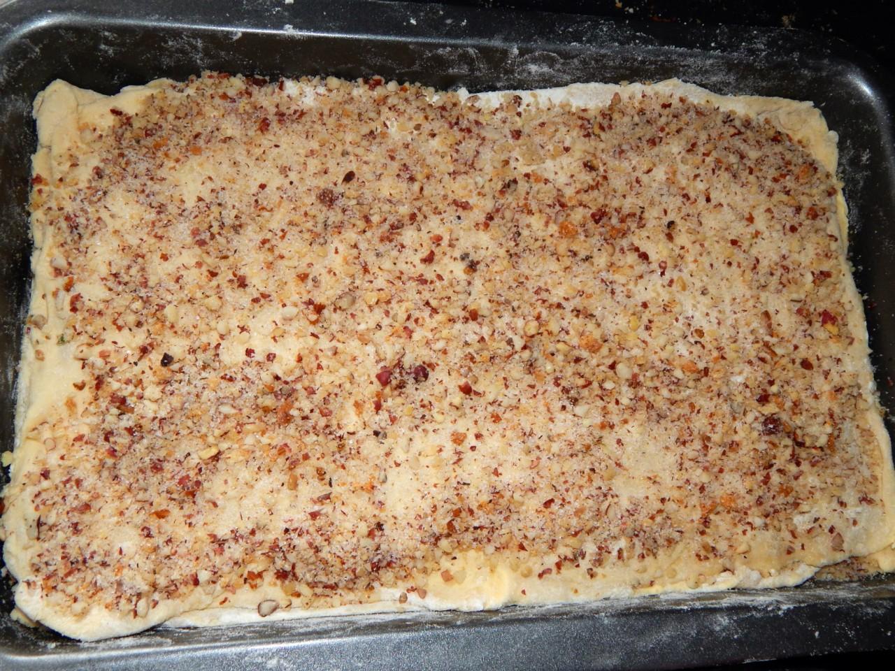 Umieść pierwszą warstwę w nasmarowanej formie. Rozłóż nadzienie orzechowe na wierzchu i robimy to z całym ciastem. Górna warstwa ciasta pozostaje bez nadzienia.