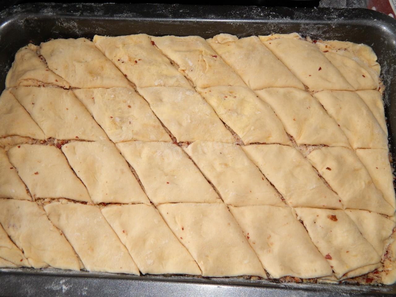 Ciasto z nadzieniem kroimy w równoległe paski, ale nożem nie docieramy do dna. Następnie kroimy również bez wpływu na ostatnią warstwę ciasta ukośnie, aby uzyskać romby.