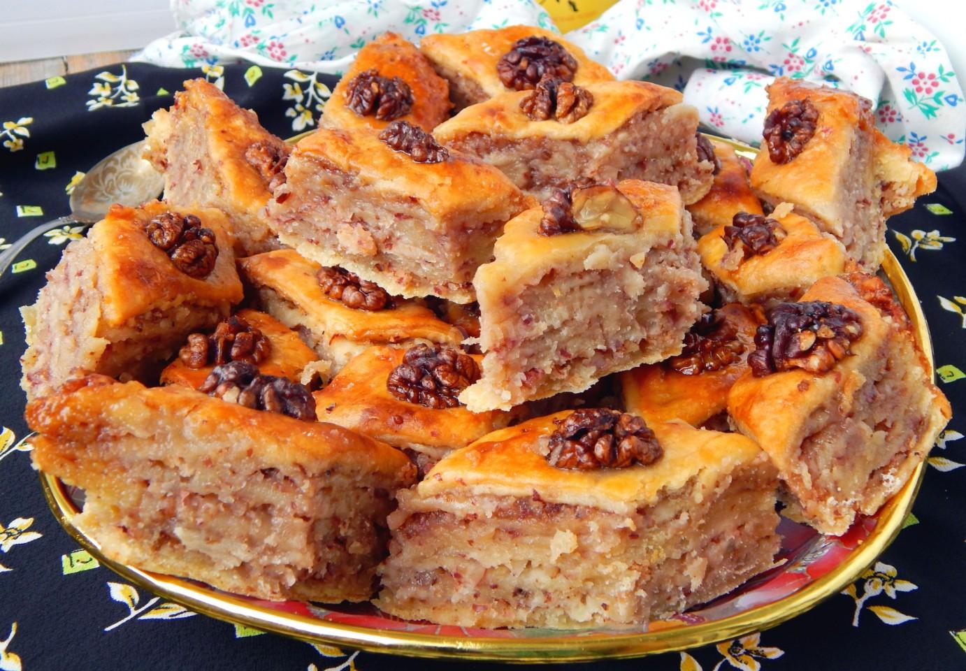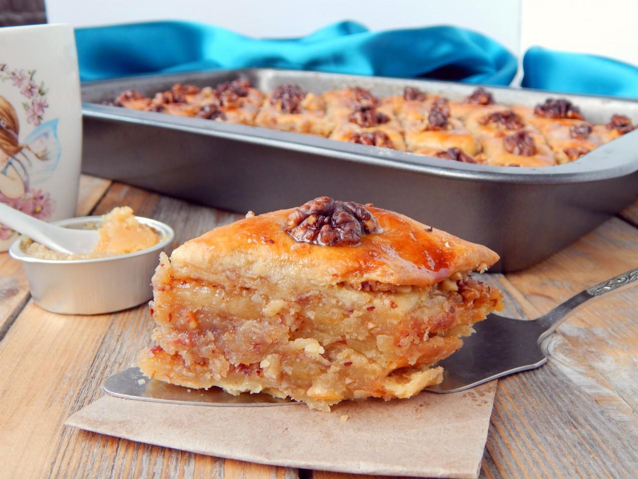 Wyjmij bakławę z piekarnika i napełnij miodem. Pozwól mu trochę namoczyć i ostygnąć. Przecinamy go do końca, układamy na talerzu i podajemy do stołu. Miłego picia herbaty!