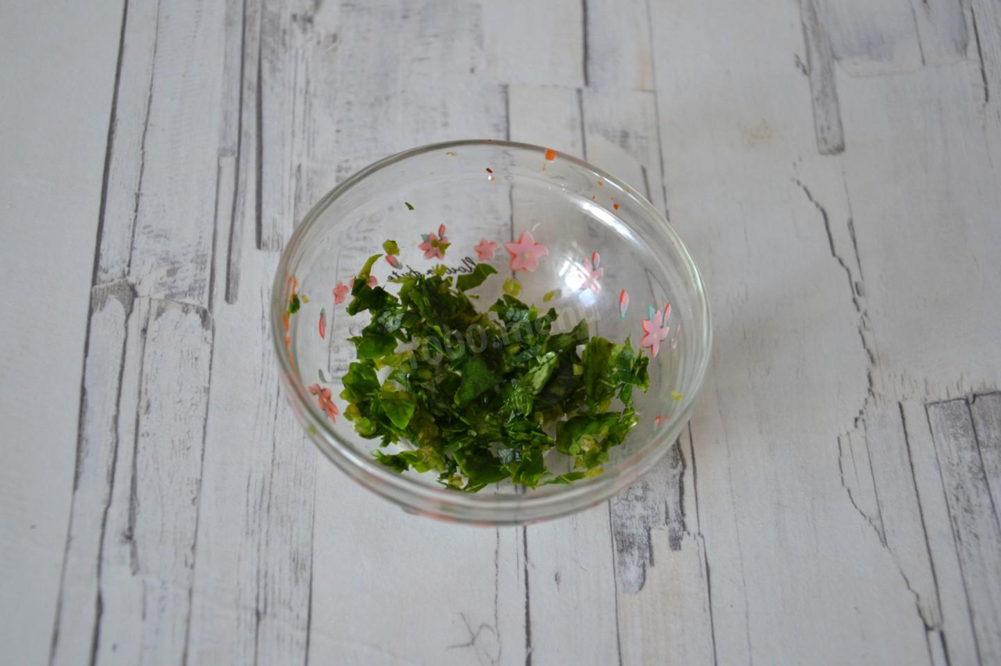 Umyj bazylię, osusz i drobno posiekaj. Jeśli nie ma świeżych ziół, możesz użyć suszonych.