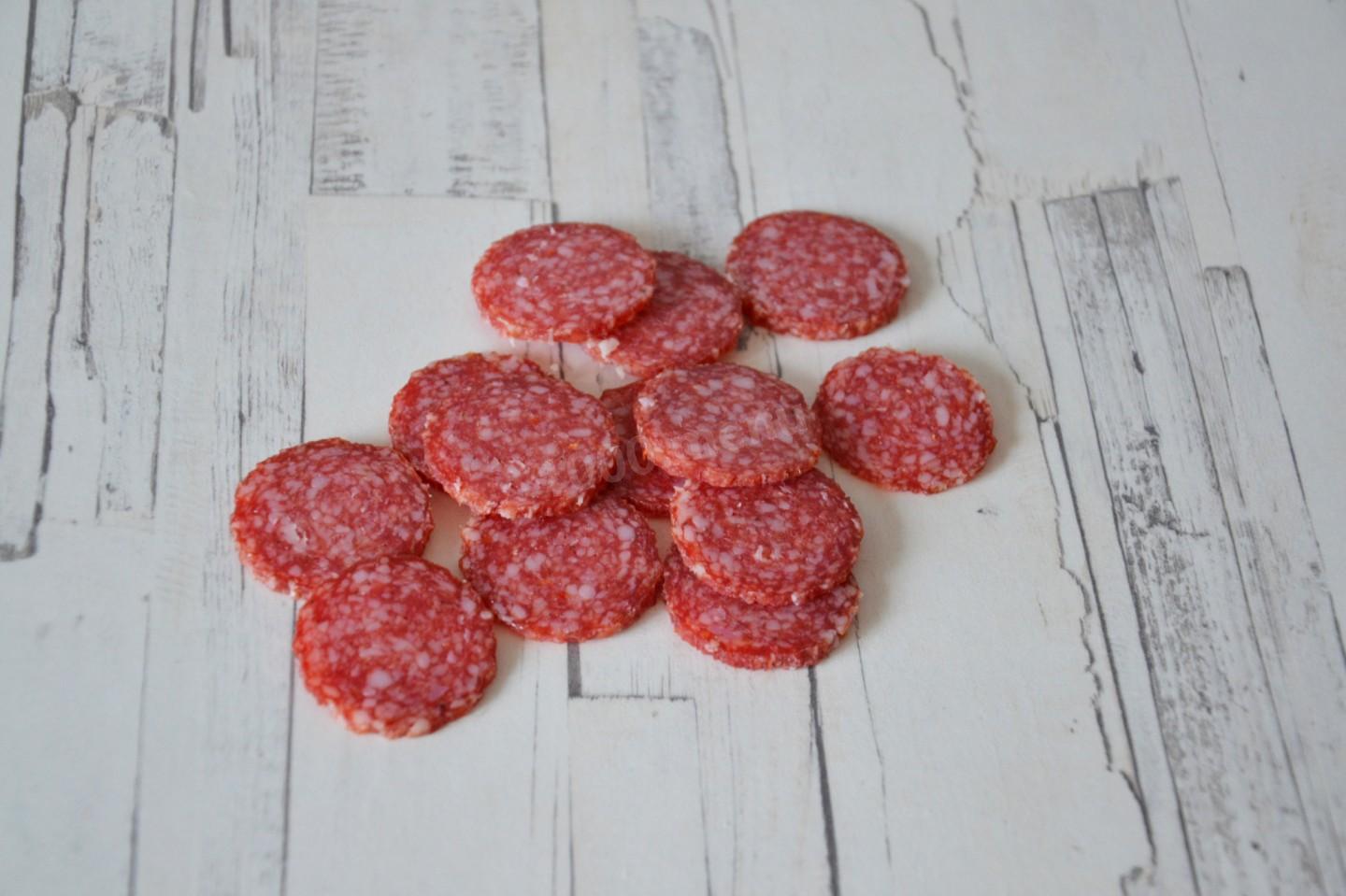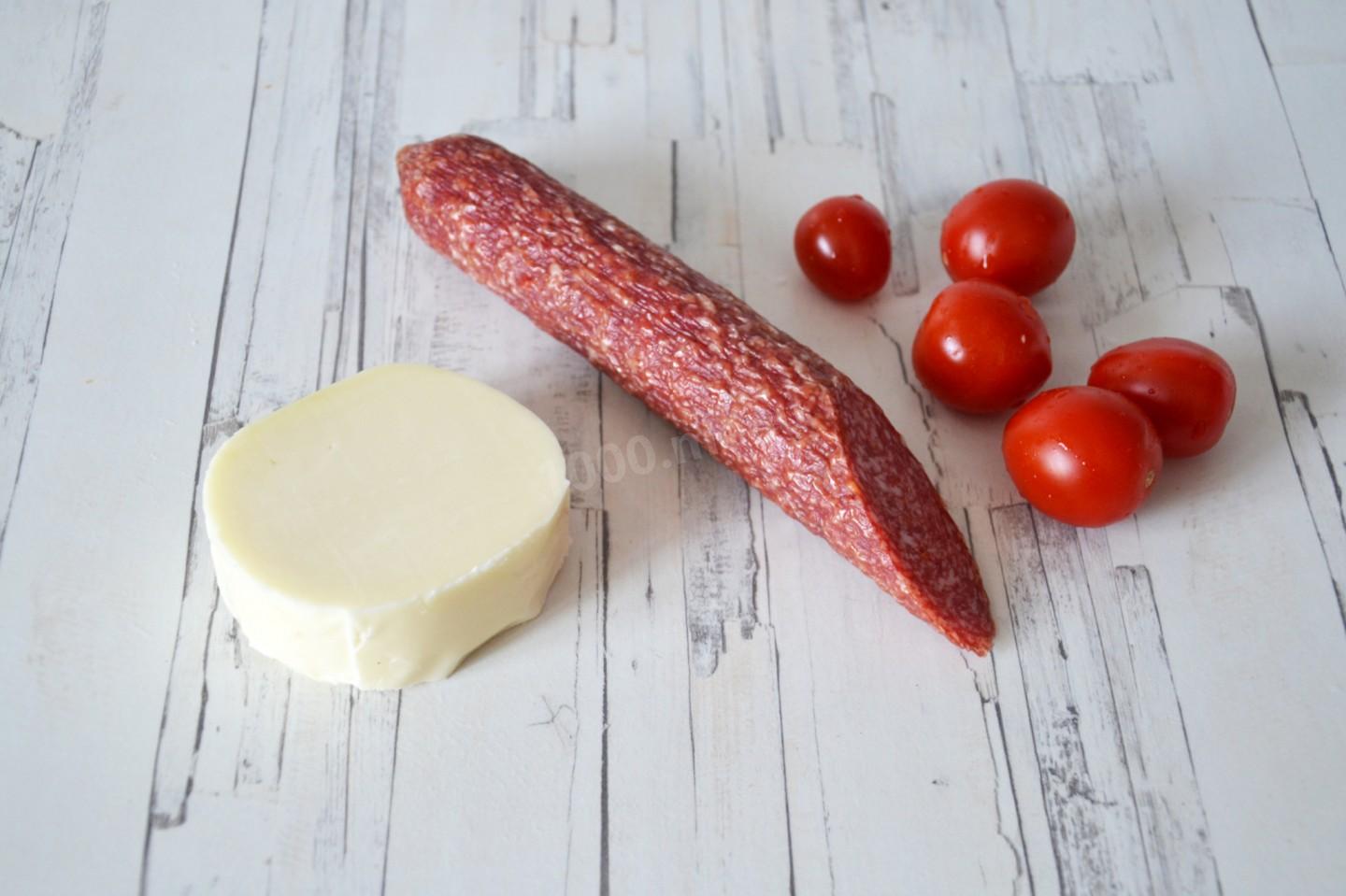 Farsz. Do nadzienia potrzebujemy: mozzarelli do pizzy, pomidorów cherry i surowej wędzonej kiełbasy (mam salami).