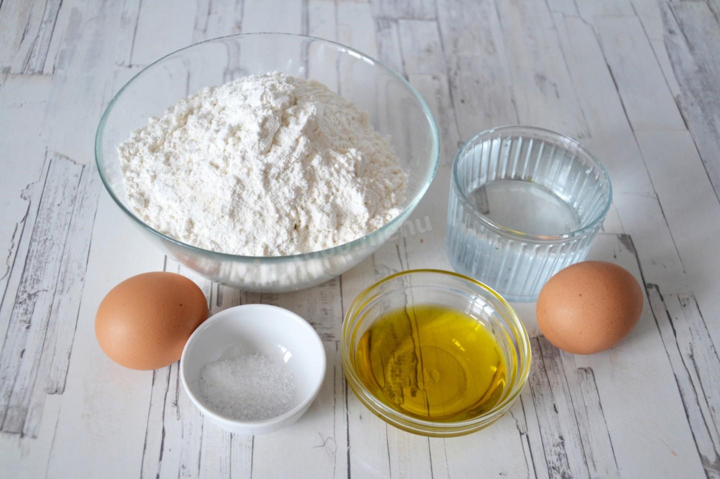 Ciasto. Do przygotowania ciasta na pizzę potrzebujemy: mąki, jajek, wody (wrzącej wody), oliwy z oliwek i soli.
