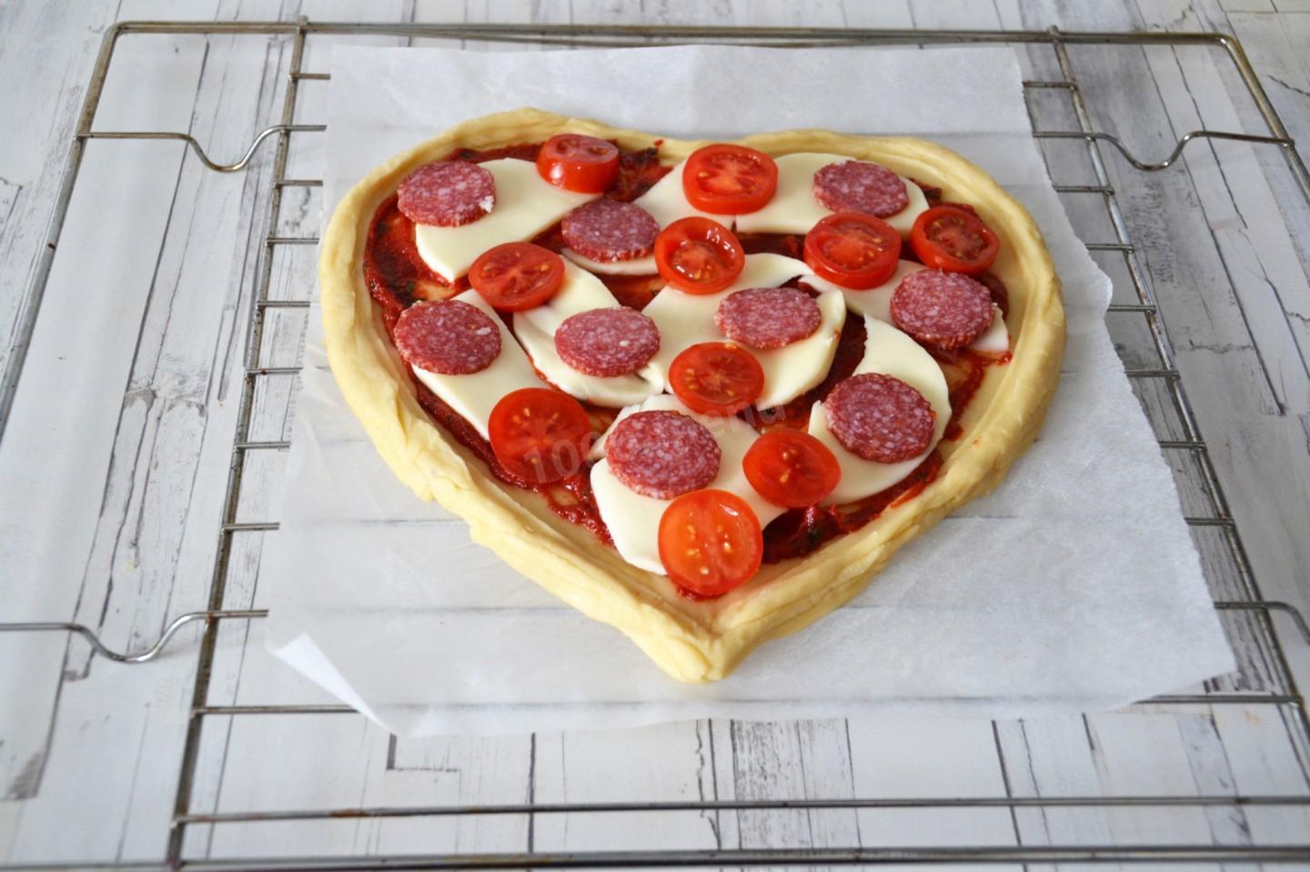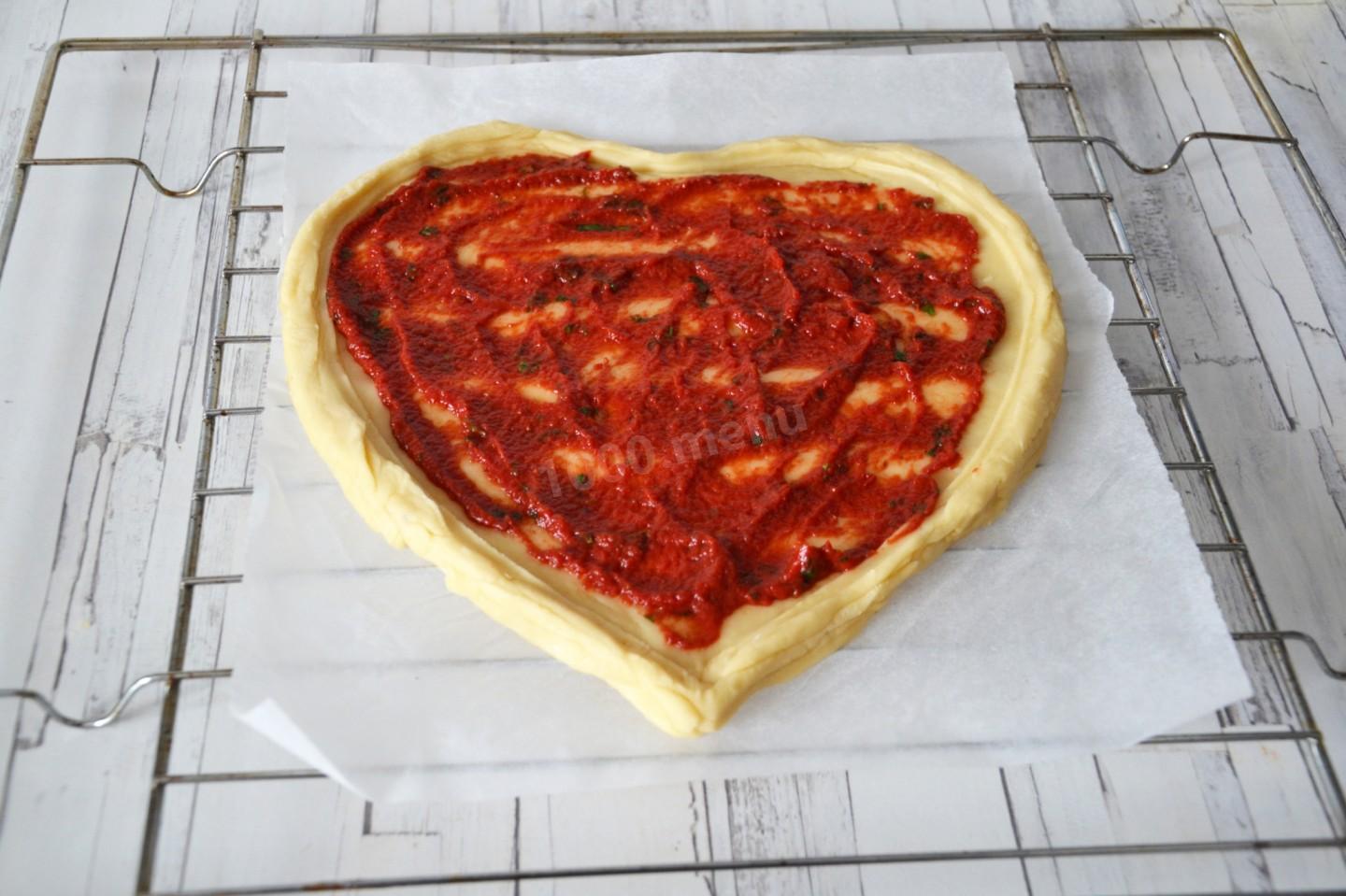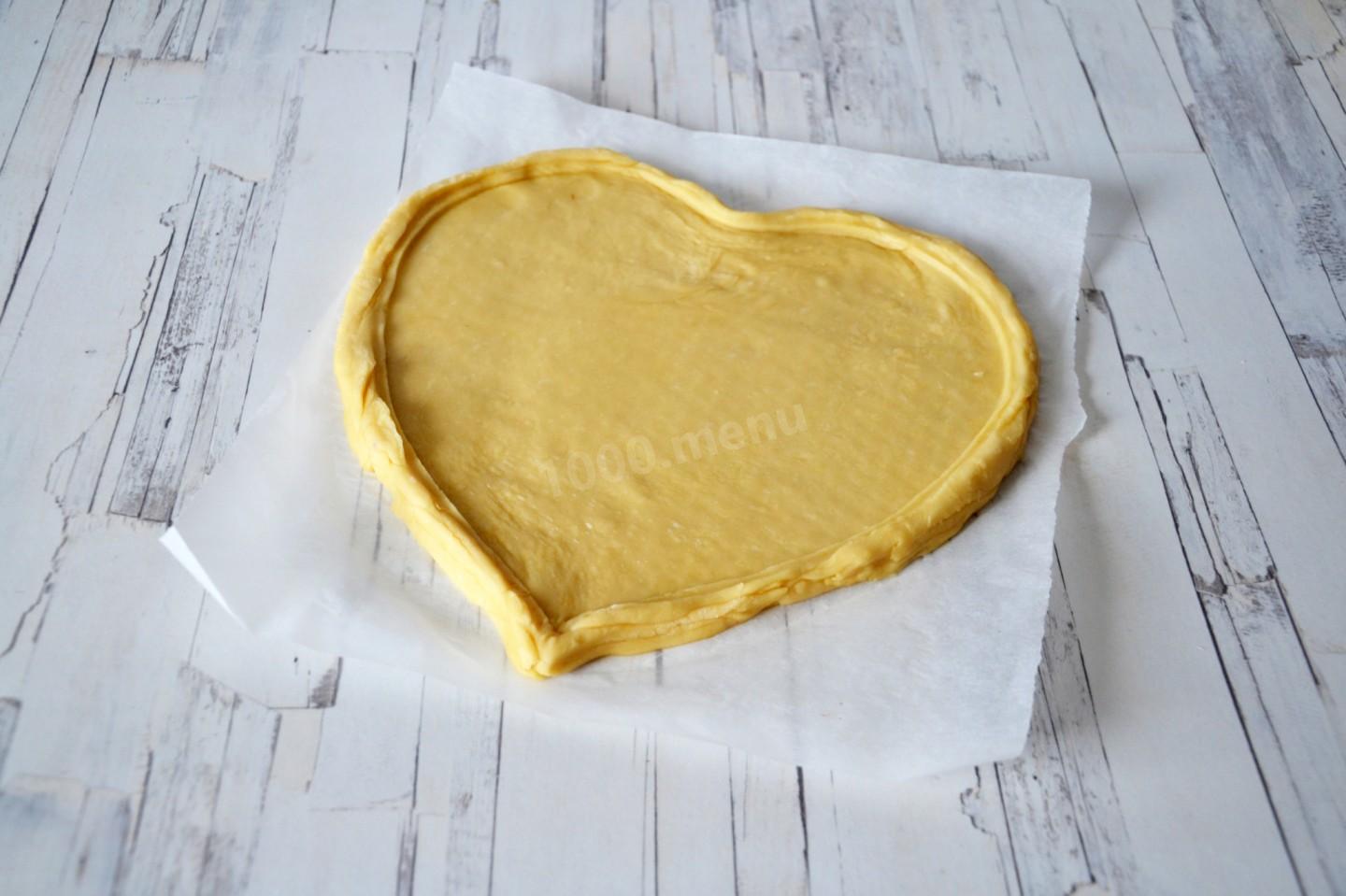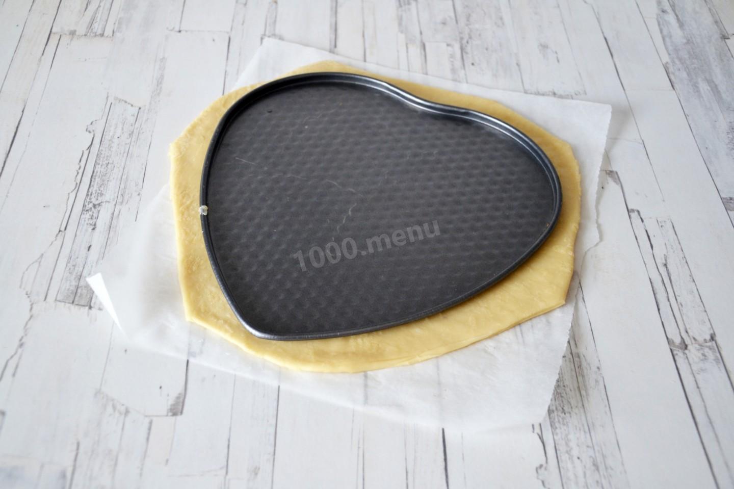 Rozwałkuj każdą część w okrąg i uformuj z każdego koła kształt serca. Robię to za pomocą DNA z dzielonej formy.Po prostu kładę go na cieście i zbieram wokół niego krawędzie, tworząc niskie boki. Podobnie uformuj drugie serce z ciasta.
