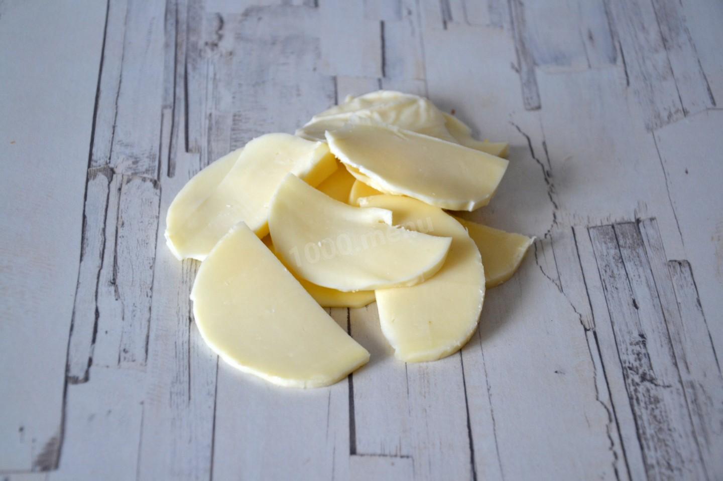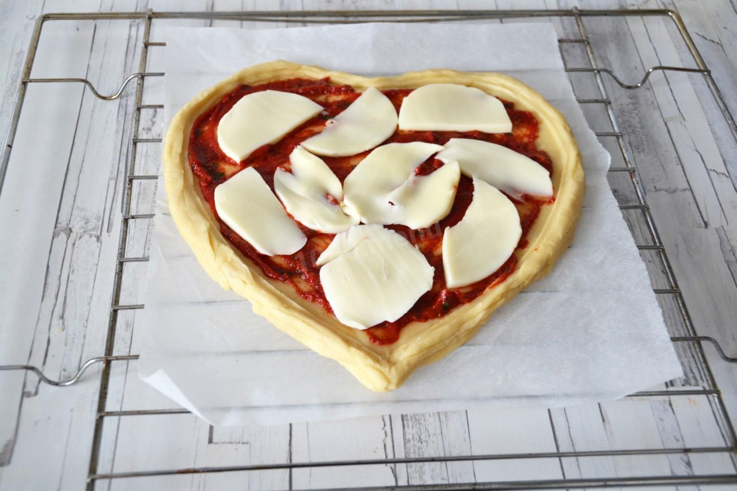 Ułóż plasterki mozzarelli na sosie. Mozzarelli nie można pokroić, ale zetrzeć na grubej tarce.