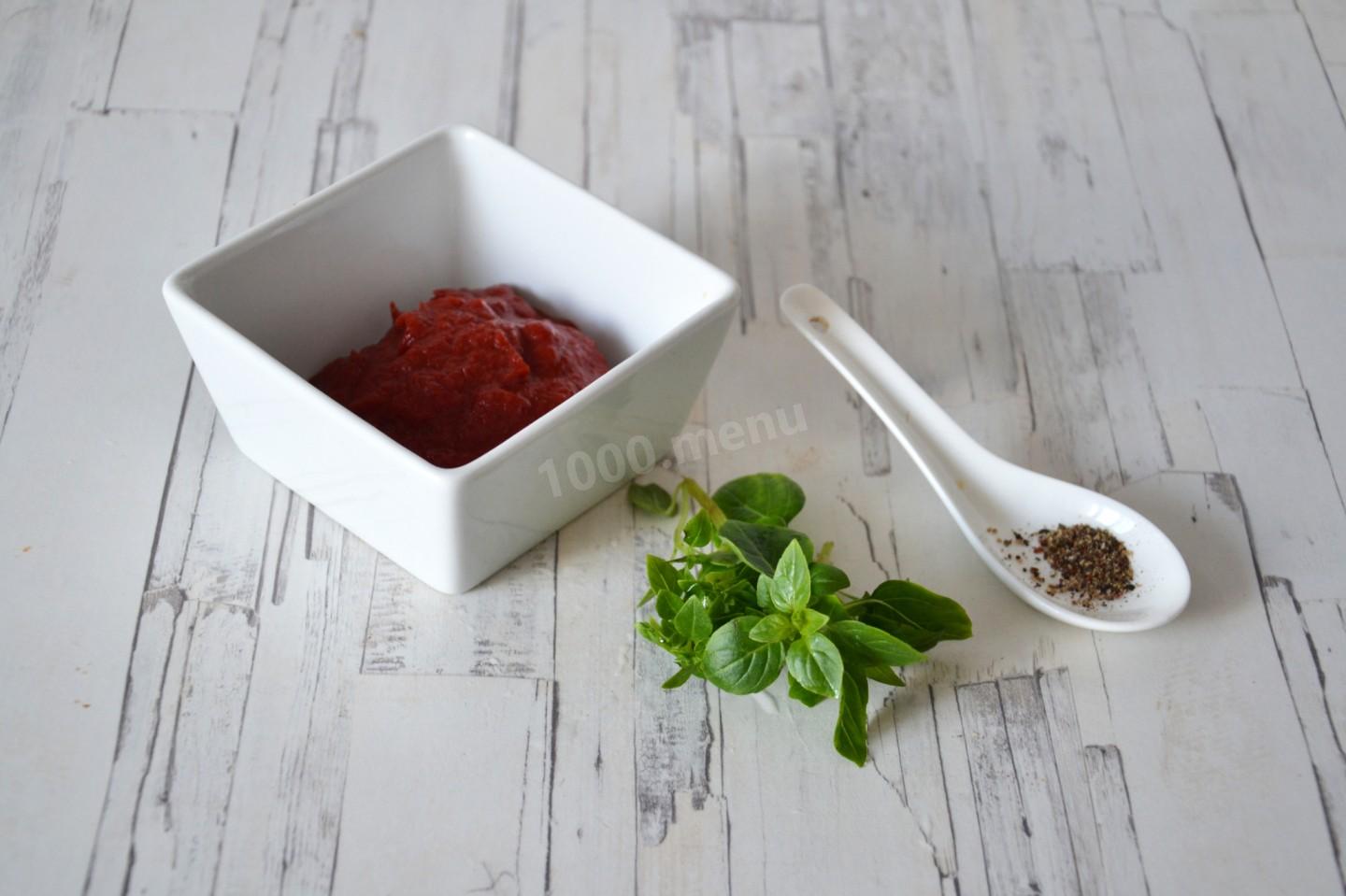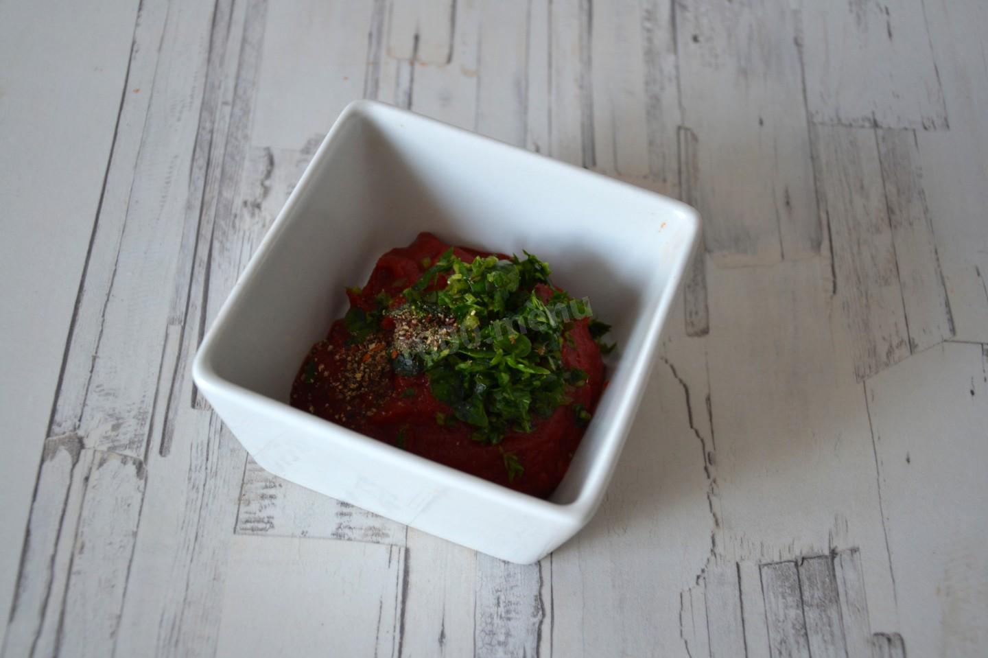 SOS. Do przygotowania sosu potrzebujemy: pasty pomidorowej, świeżej bazylii, mieszanki świeżo zmielonej papryki.