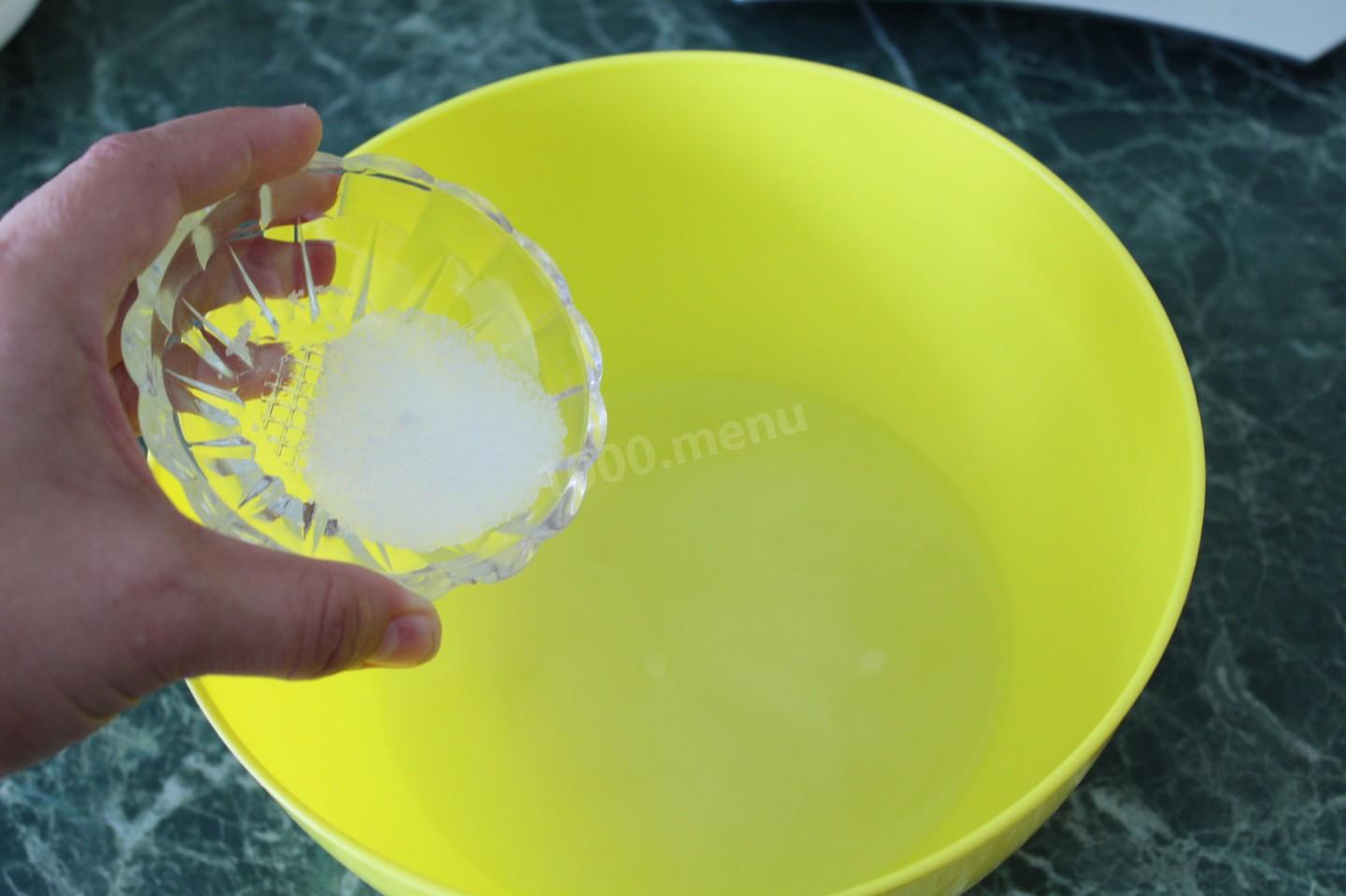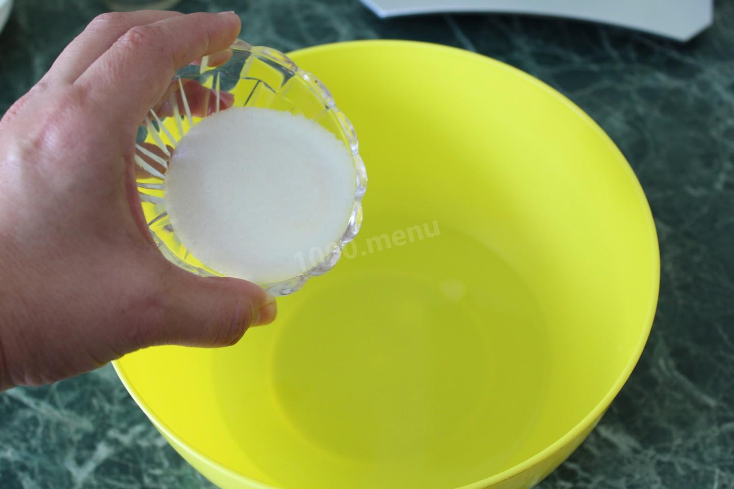 Wlej 0,5 szklanki lekko ciepłej serwatki do miski, dodaj do niej 2 łyżeczki cukru i posiekaj 10 gramów świeżych drożdży. Wszystko dobrze wymieszaj, aby rozpuścić cukier i drożdże. Masa drożdży zacznie zwiększać objętość i bulgotać.