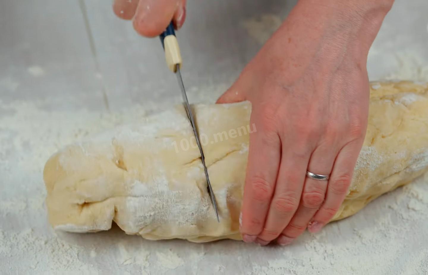 Po upływie czasu rozprowadzamy ciasto na stole posypanym niewielką ilością mąki i po uformowaniu dzielimy je na trzy identyczne części.