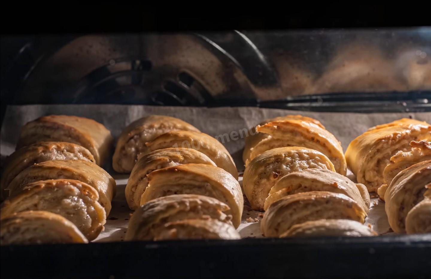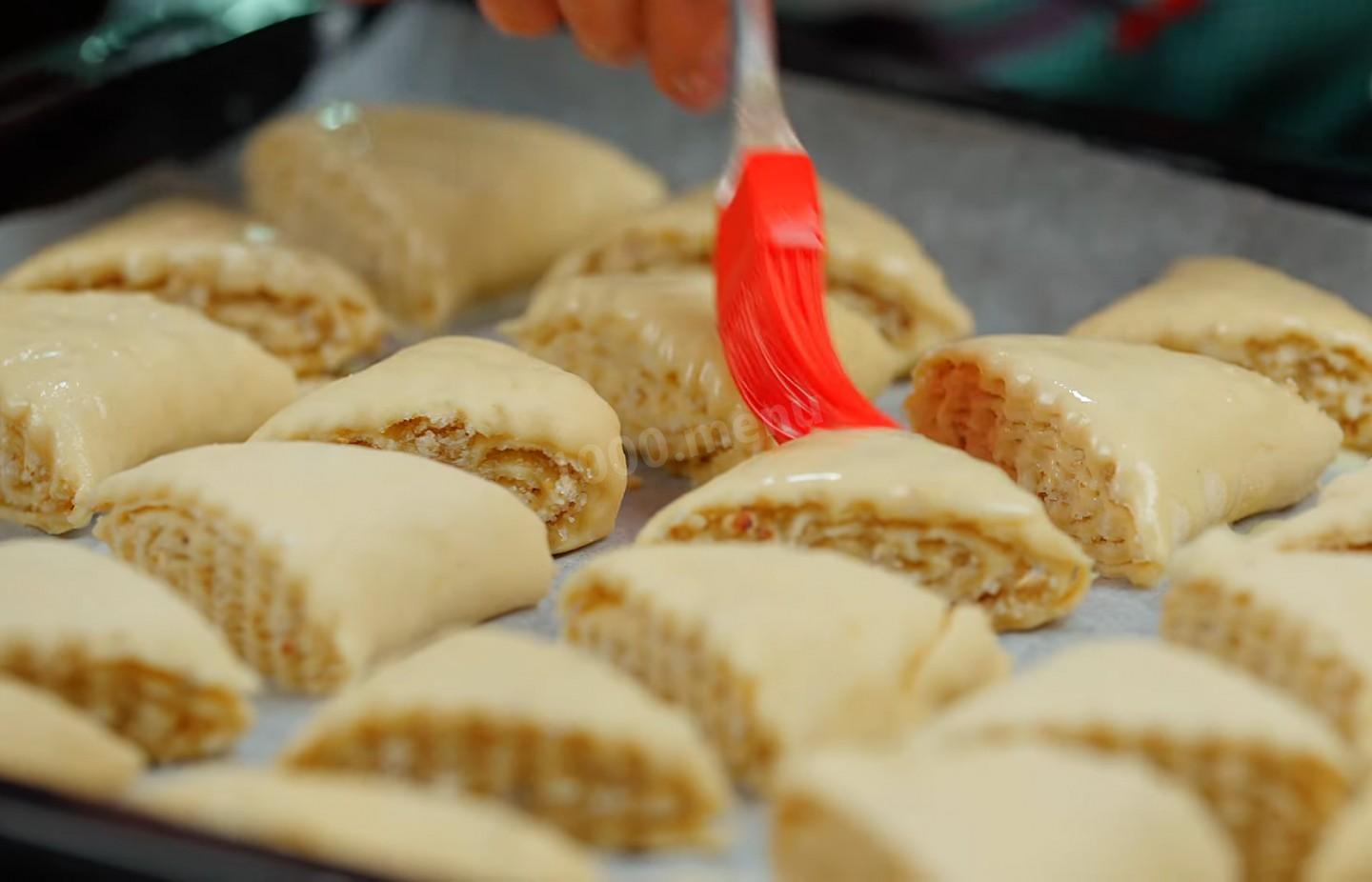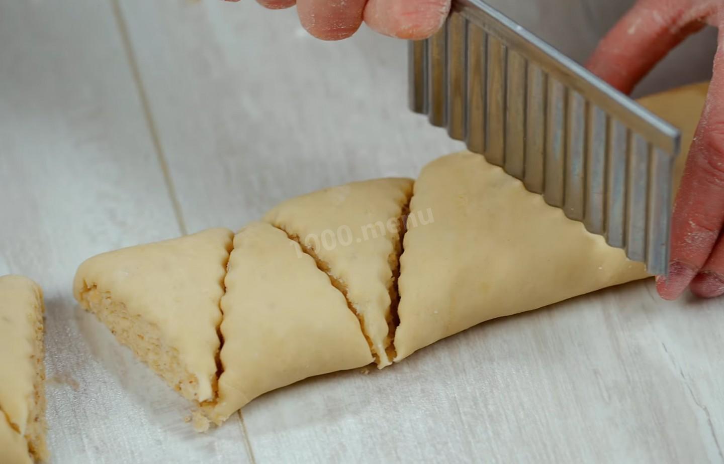 Kroimy rolki kręconym nożem na w przybliżeniu równe trójkątne kawałki, które następnie układamy na blasze wyłożonej pergaminem.