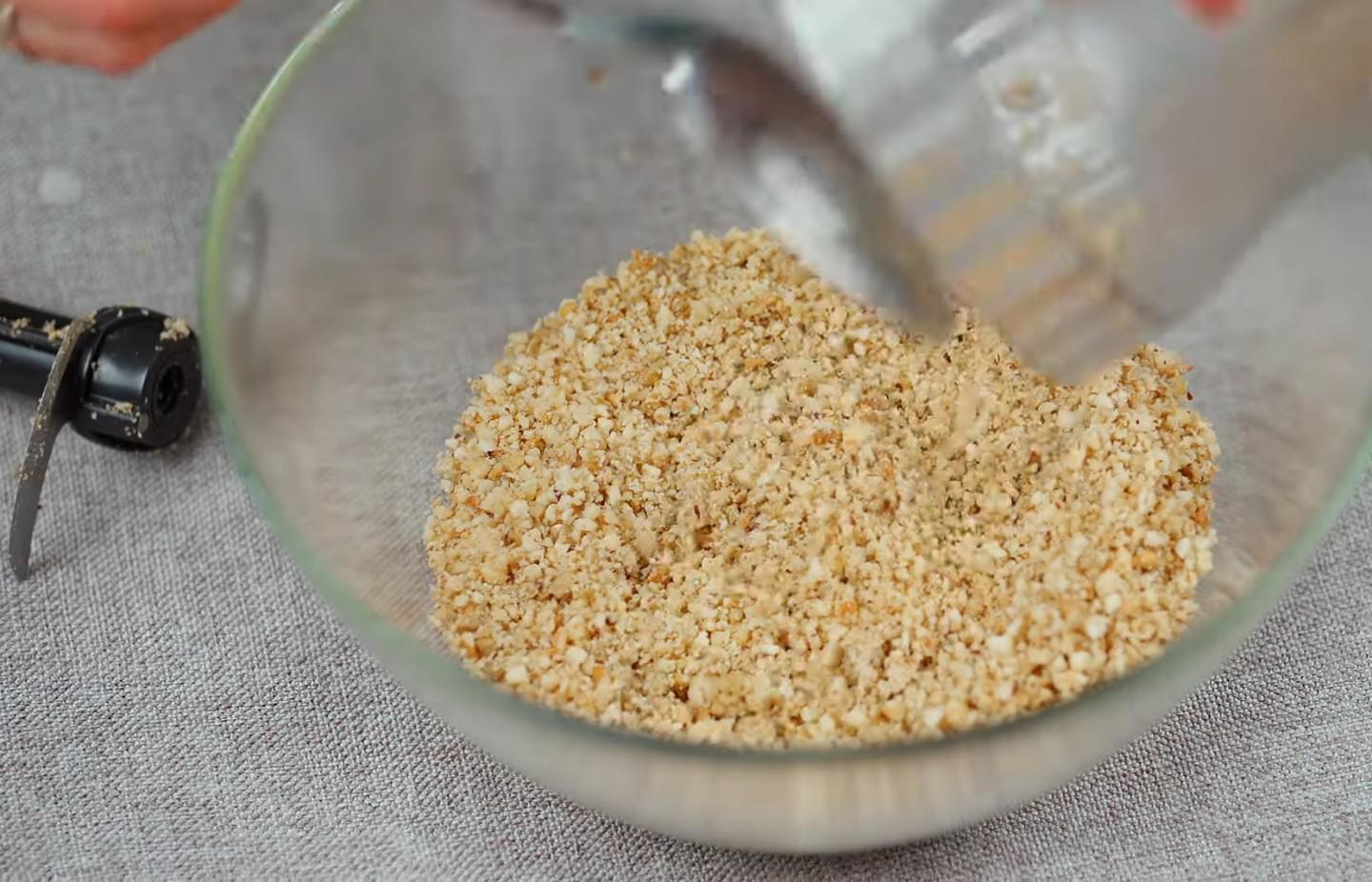Zmiksuj sto pięćdziesiąt gramów mieszanki orzechów włoskich z obranymi nasionami za pomocą blendera i wlej do głębokiej miski.