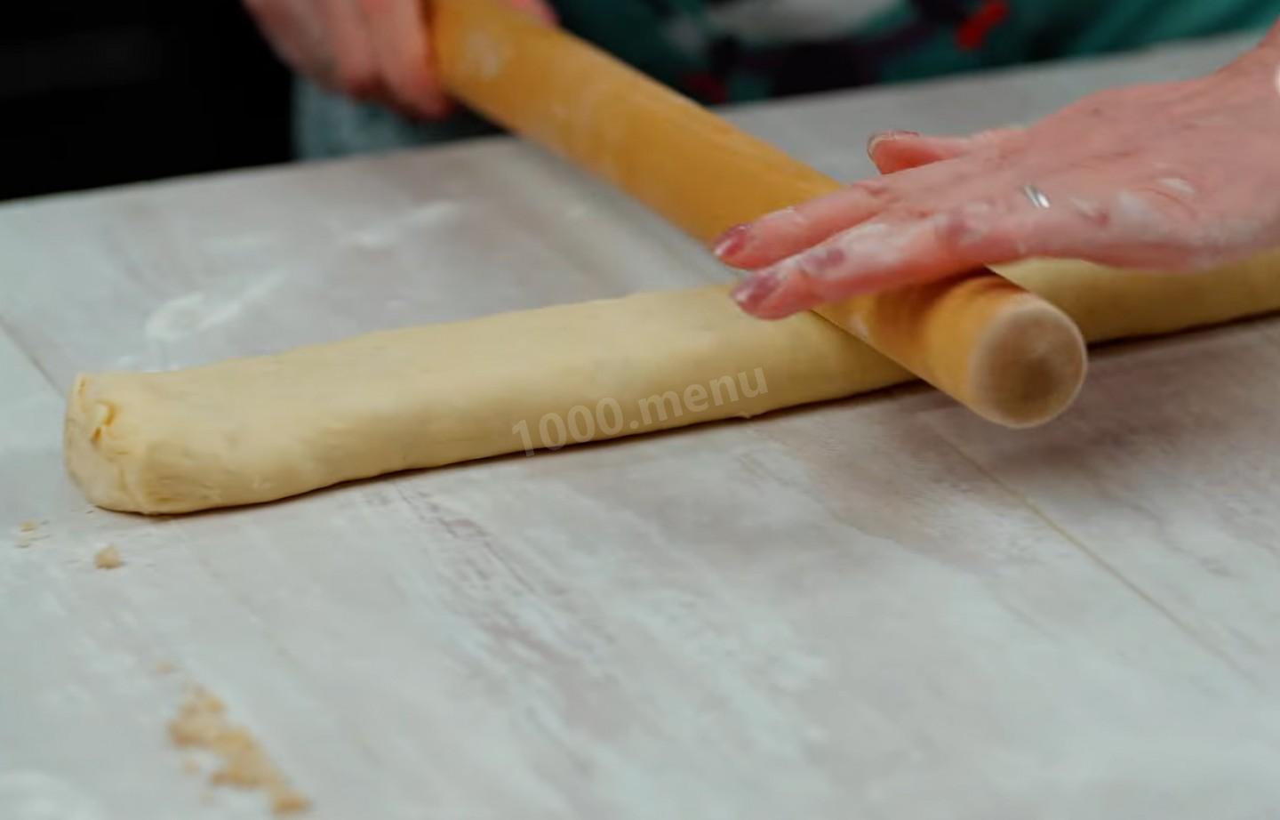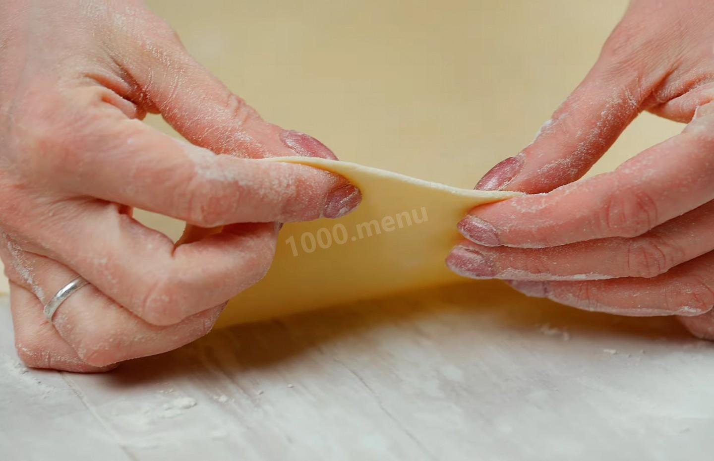 Rozwałkuj każdy kawałek ciasta na cienkie ciasta, najlepiej prostokątne, o grubości około dwóch do trzech milimetrów.