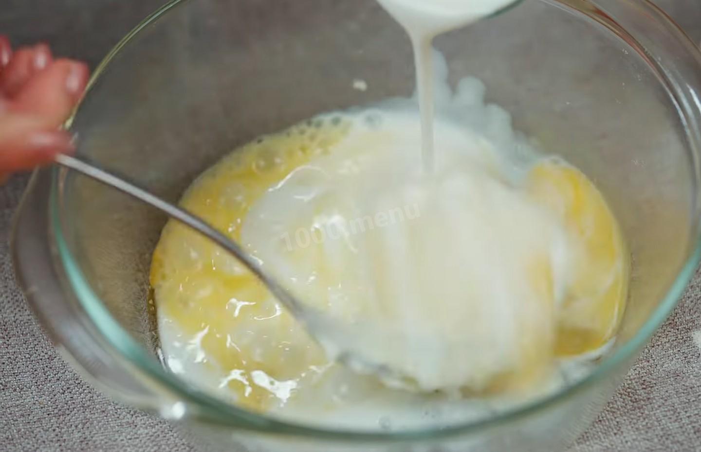 Rozbij jedno jajko kurze do głębokiej miski i ubij, a następnie wlej do niego dwieście pięćdziesiąt mililitrów kefiru o temperaturze pokojowej.