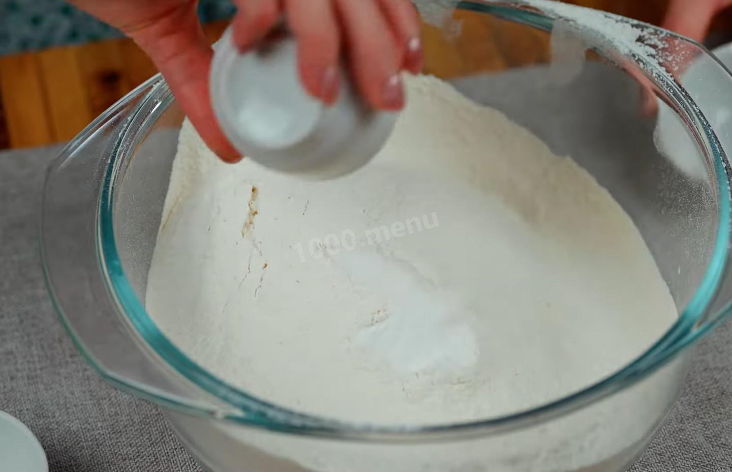 Aby przygotować ciasto, przesiej pięćset gramów mąki pszennej do miski objętościowej, a następnie wlej do niej pół łyżeczki sody, jedną czwartą łyżeczki soli i jedną łyżeczkę cukru waniliowego i wymieszaj wszystkie składniki.