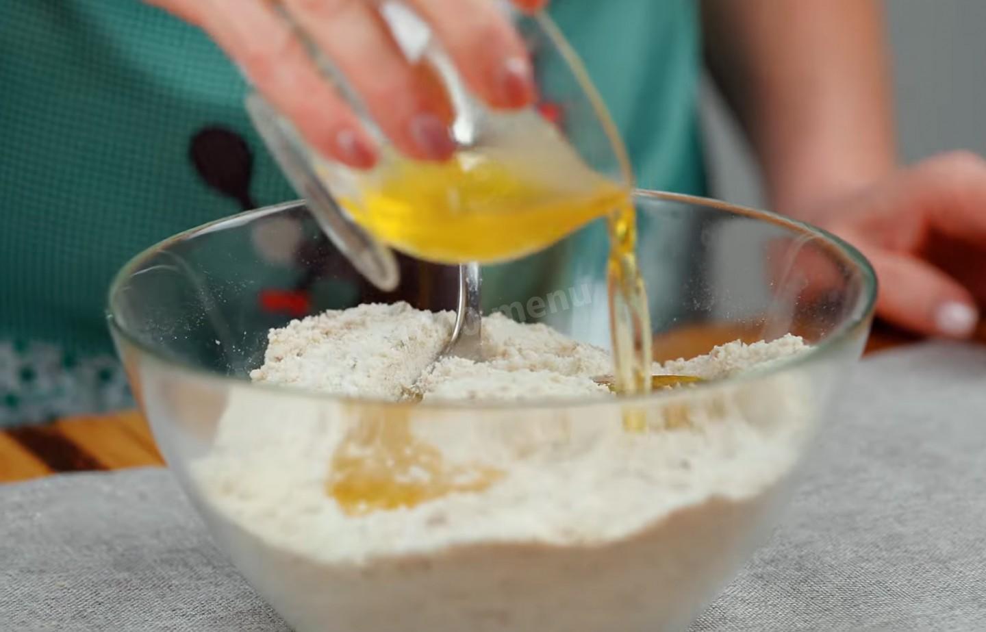 Wlej siedemdziesiąt gramów roztopionego masła lub ghee do miski z suchymi składnikami.