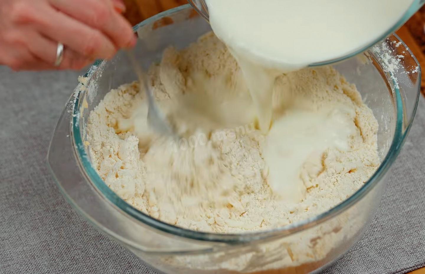 Wlej płynną bazę do obszernej miski z leniwym ciastem francuskim.