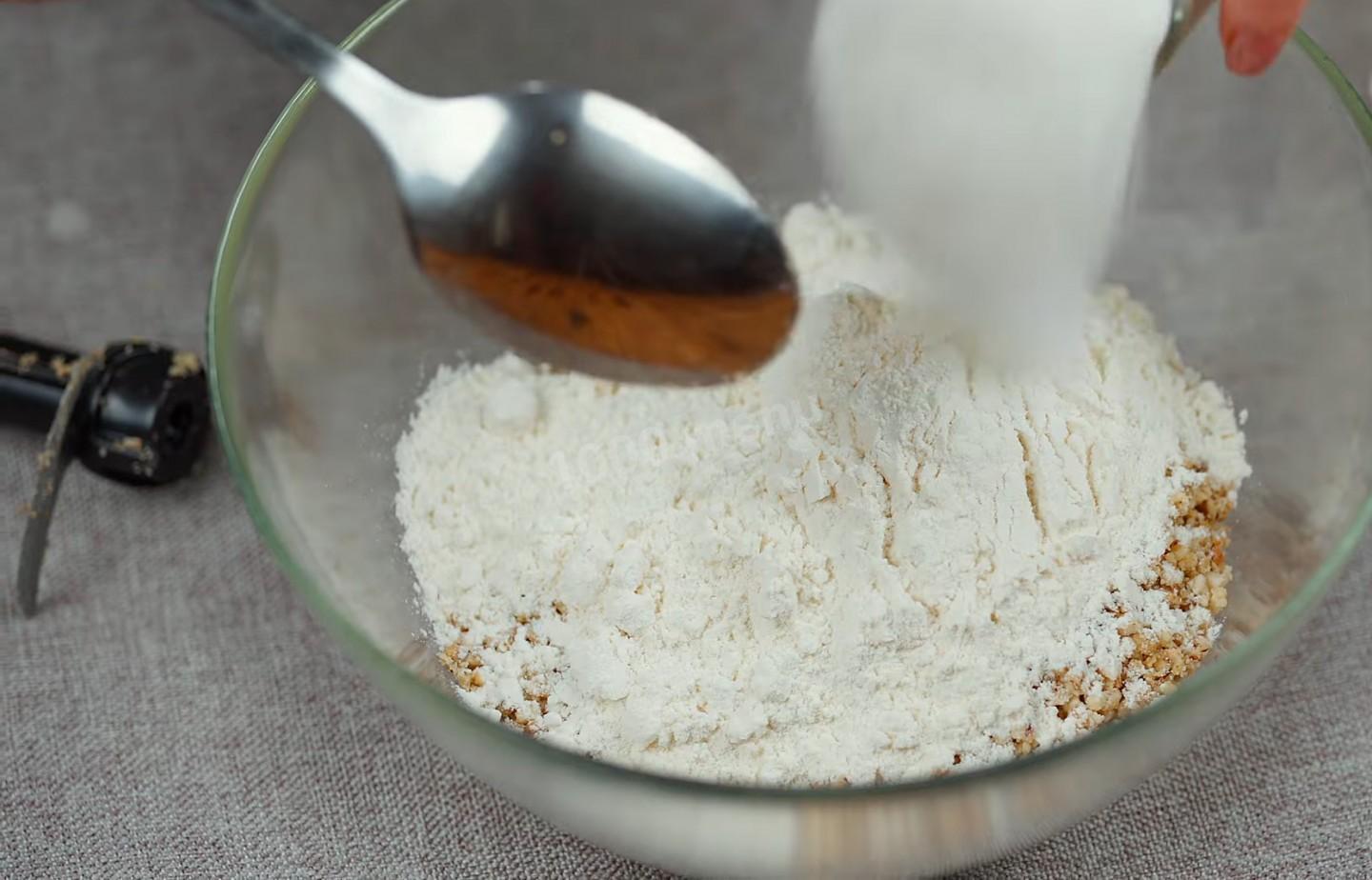Wlej osiemdziesiąt gramów mąki pszennej i dwieście pięćdziesiąt gramów cukru do miski z posiekanymi orzechami i nasionami.