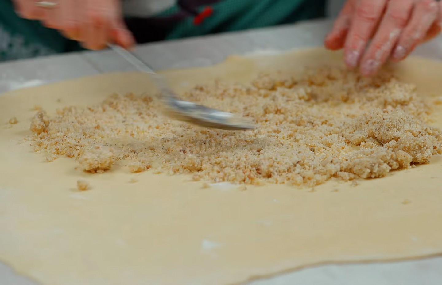 Na każde ciasto rozprowadzamy wymaganą ilość przygotowanego nadzienia, które następnie rozprowadzamy jednolitą cienką warstwą, nie sięgając do krawędzi ciasta, około czterech centymetrów.