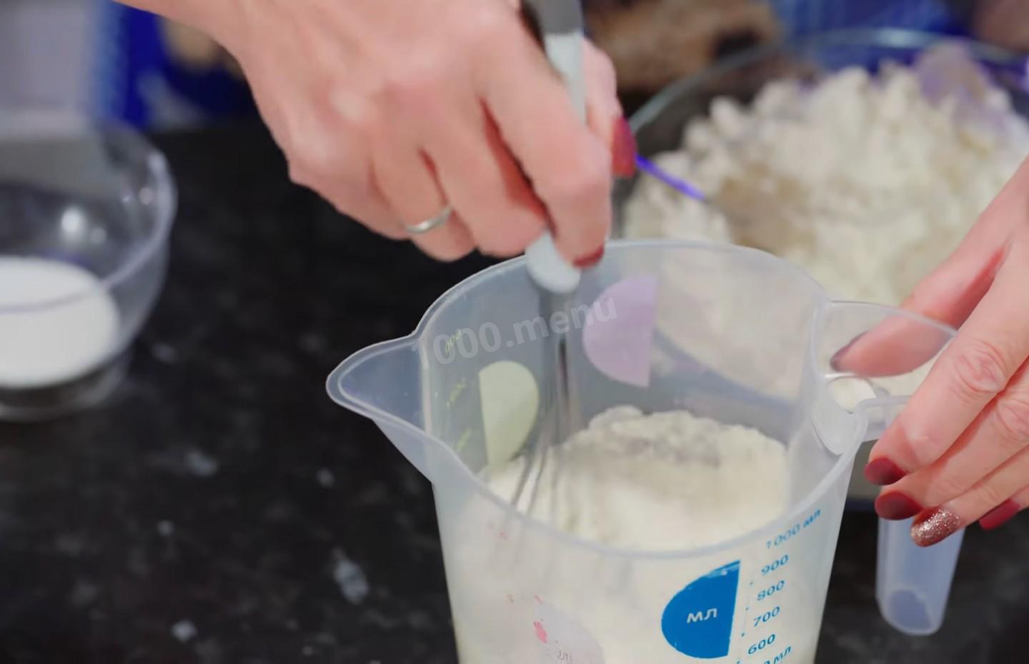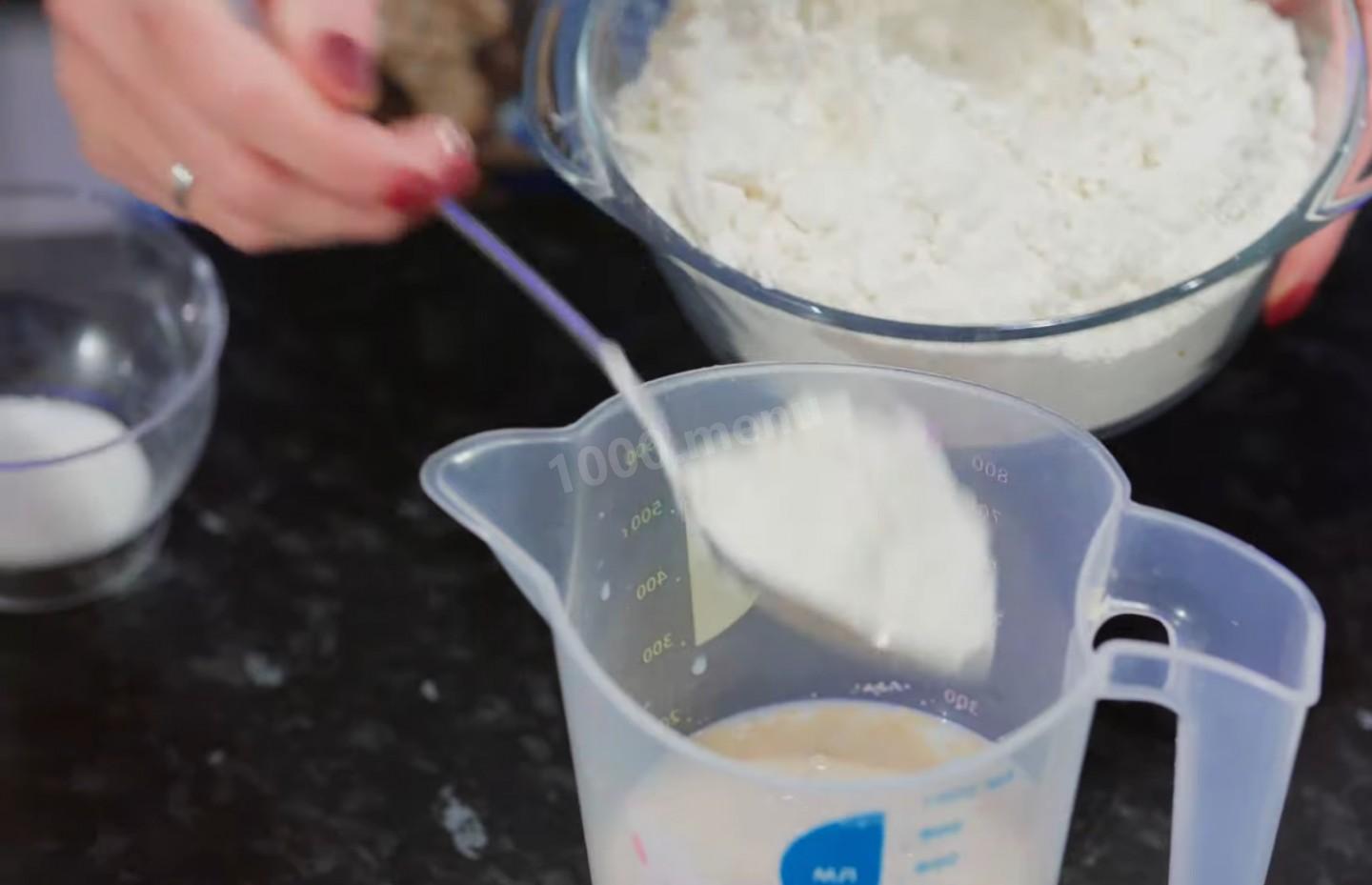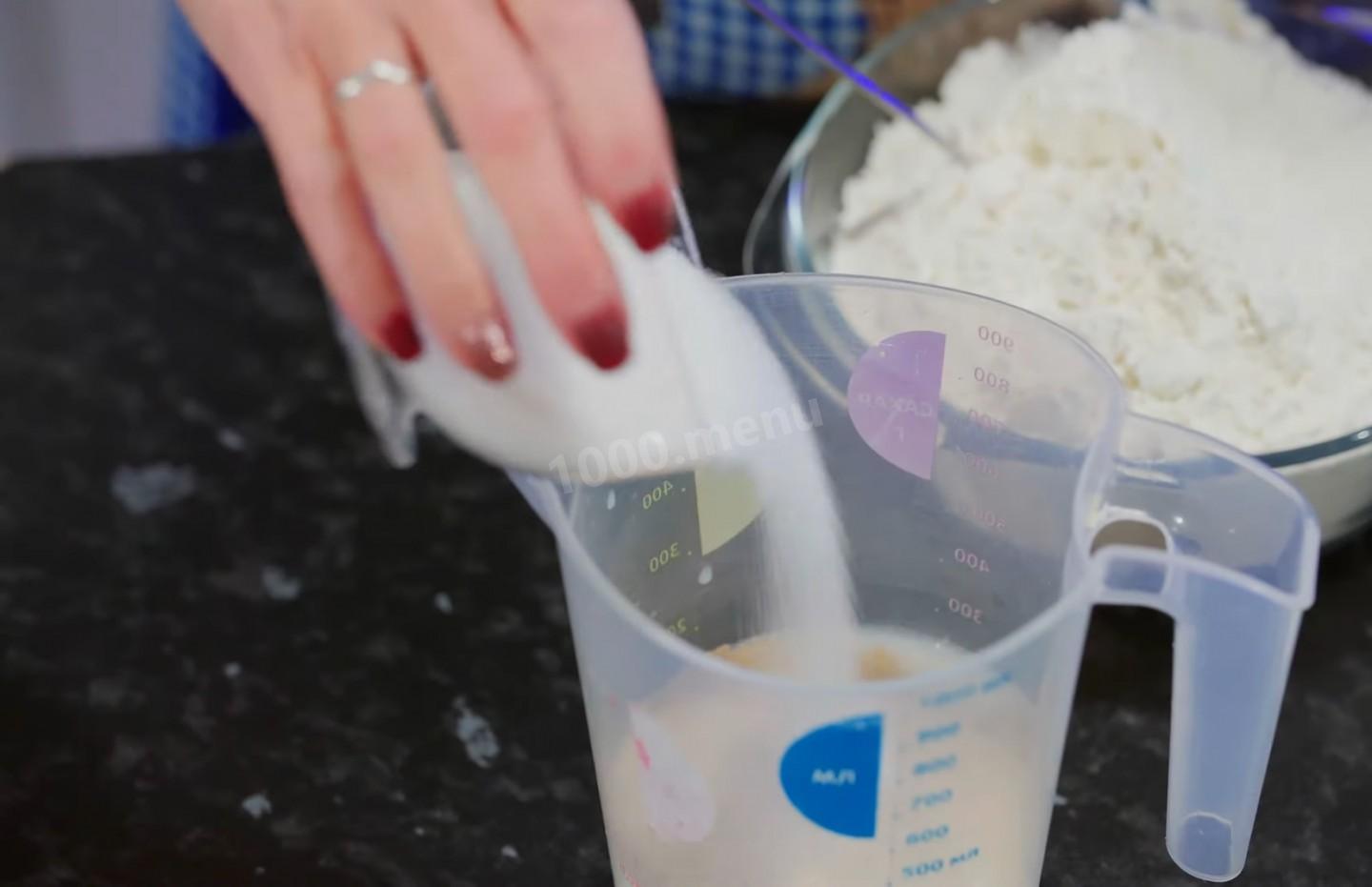 Wlej dwieście pięćdziesiąt mililitrów mleka o temperaturze pokojowej do miarki, a następnie wlej do niej siedem gramów suchych drożdży i siedemdziesiąt pięć gramów cukru.