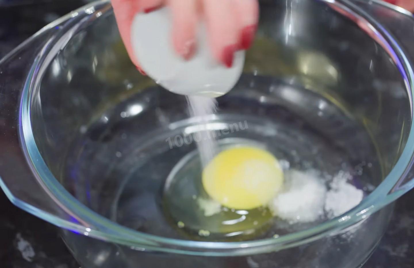 Rozbij jedno jajko kurze do obszernej miski, a następnie wlej do niego ćwierć łyżeczki soli i jedną łyżeczkę cukru waniliowego.
