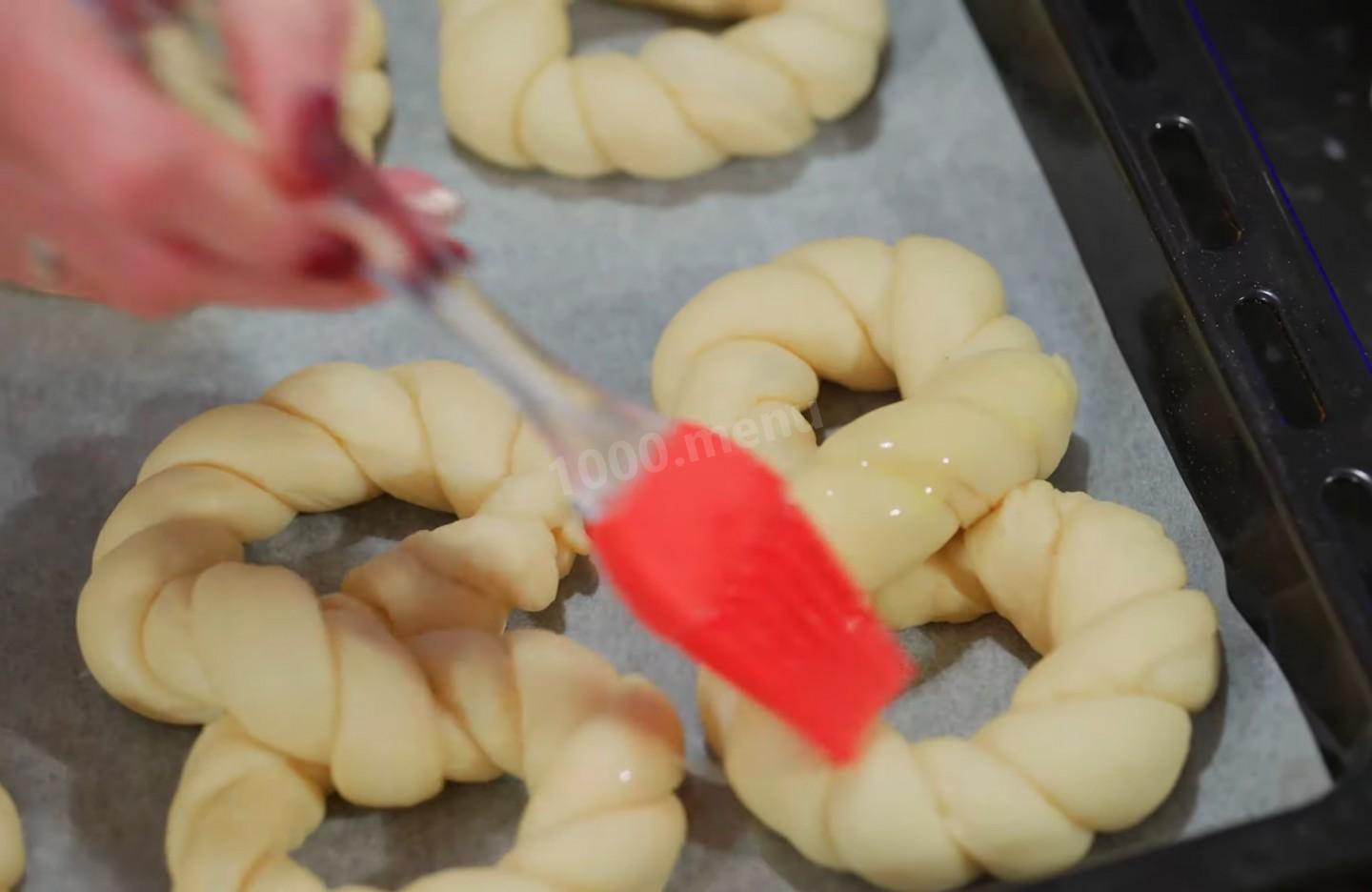 Po wyrośnięciu posmaruj bułki ubitym jajkiem kurzym.