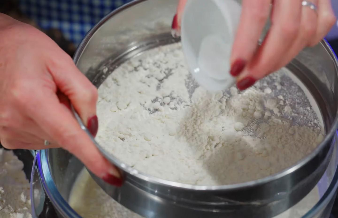 Przesiać do miski z płynną bazą pięćset gramów mąki pszennej i wlać pół łyżeczki proszku do pieczenia. Uważaj na to, że możesz mieć więcej lub mniej mąki niż ja.