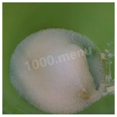 Przenieś masło do pojemnika, dodaj cukier! A wszystko to ubijamy prawie do kremowej bazy.