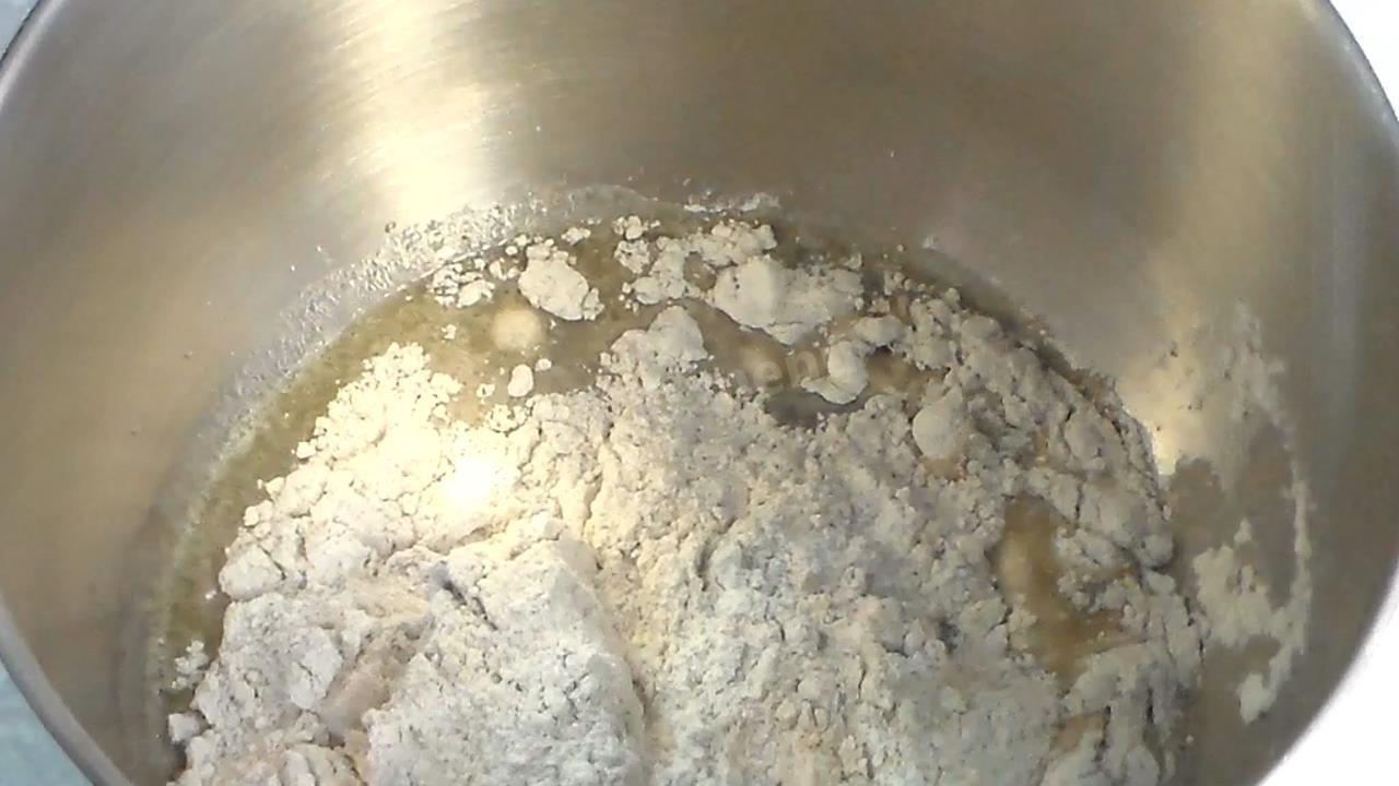Wlej olej roślinny i serwatkę podgrzaną do temperatury pokojowej do miski do ugniatania. Następnie wlej sól i porcję przesianej mąki.