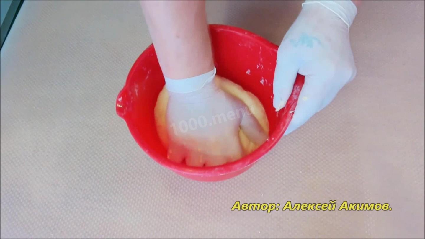 Zagniataj ciasto. Dodaj jajka, sól, olej roślinny do wody(125 ml), wymieszaj. Dodaj proszek do pieczenia do mąki i przesiej do mieszanki jajecznej. Zagniataj ciasto przez co najmniej 7-10 minut. Przykryj folią i wstaw do lodówki na 1 godzinę.