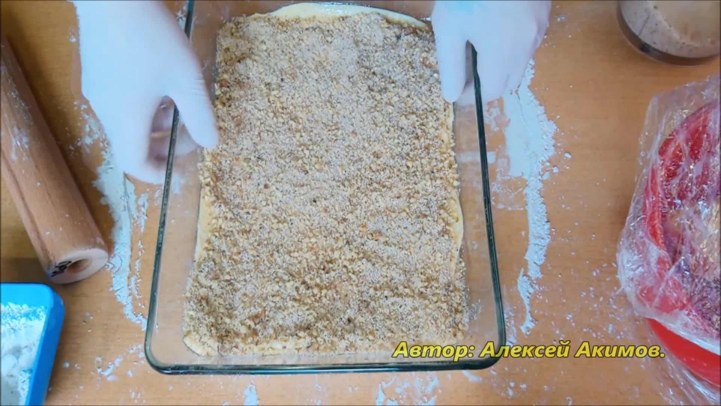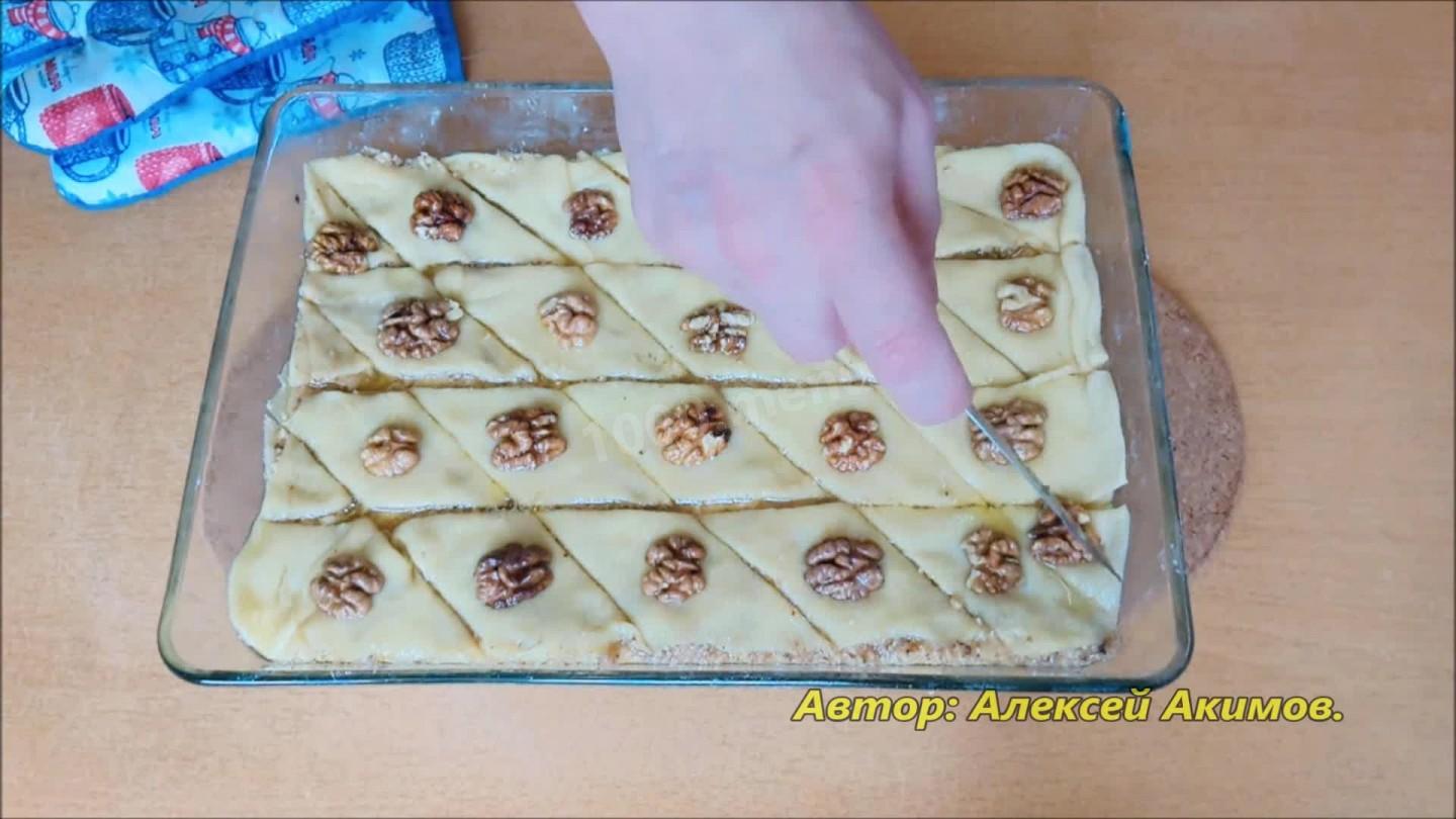 Ciasto dzielimy na cztery części i zwijamy, odkurzając skrobią. Na wysmarowanym masłem naczyniu do pieczenia kładziemy pierwszy arkusz ciasta i obficie smarujemy roztopionym masłem. Kładziemy jedną trzecią nadzienia. Wykonujemy tę operację jeszcze dwa razy. Przykryj czwartym arkuszem ciasta i pokrój w potrzebne rozmiary. Obficie posmaruj masłem, udekoruj orzechami i włóż do piekarnika nagrzanego do 180 stopni Celsjusza na 15 minut.