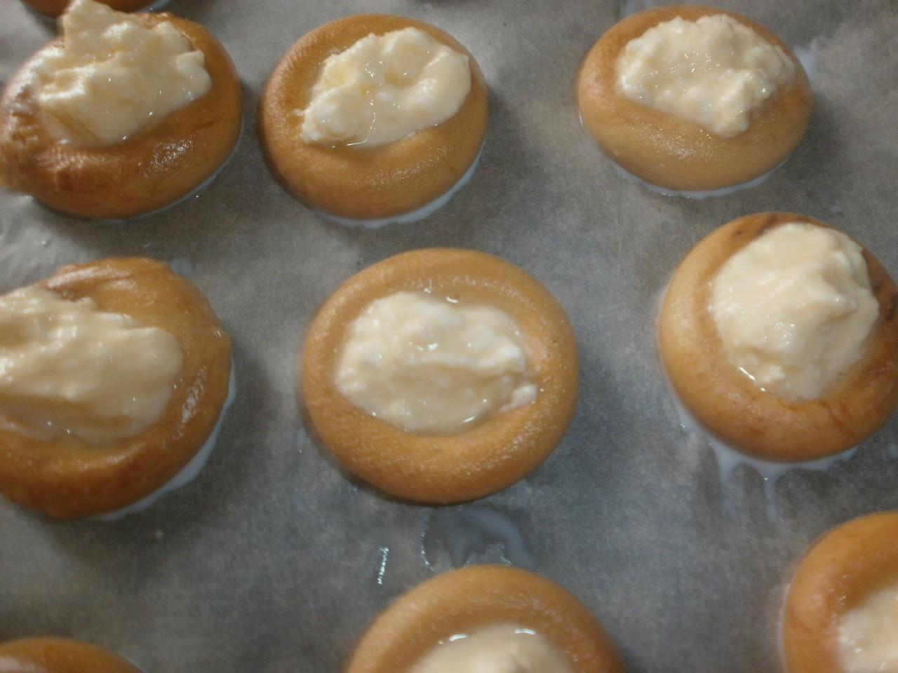 Teraz łyżeczką bierzemy masę twarogową i wypełniamy środek suszarek.Wziąłem łyżkę na czubek, więc masa ześlizgnęła się szybciej.....Po wypełnieniu wszystkich suszarek wysyłamy naszą blachę do piekarnika nagrzanego do 200 stopni. I piec około 10-15 minut w temperaturze 200 gr.Uwaga czas zależy od piekarnika.