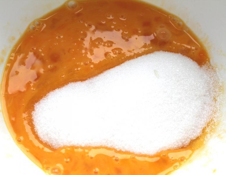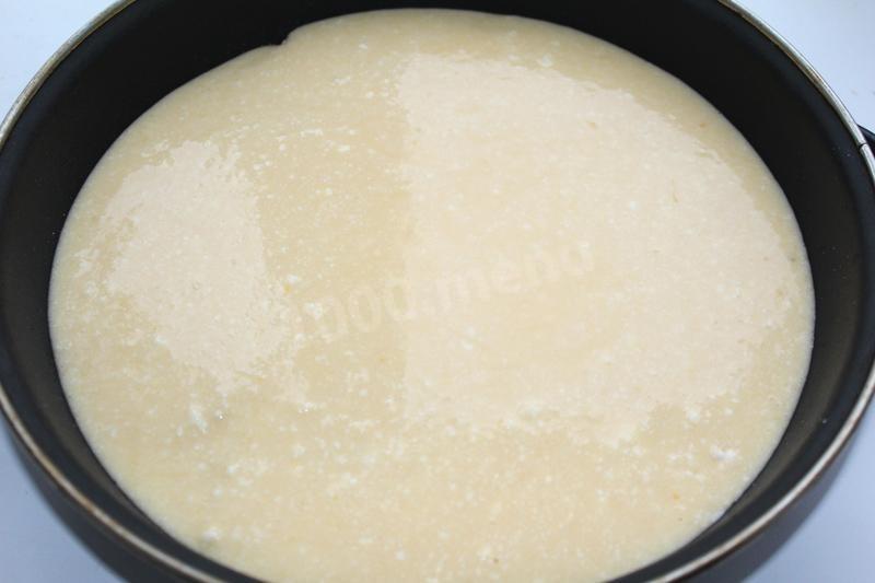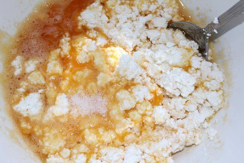 zmielić jajka z cukrem. Dodaj puree z twarogu, szczyptę waniliny lub skórki, skrobię.